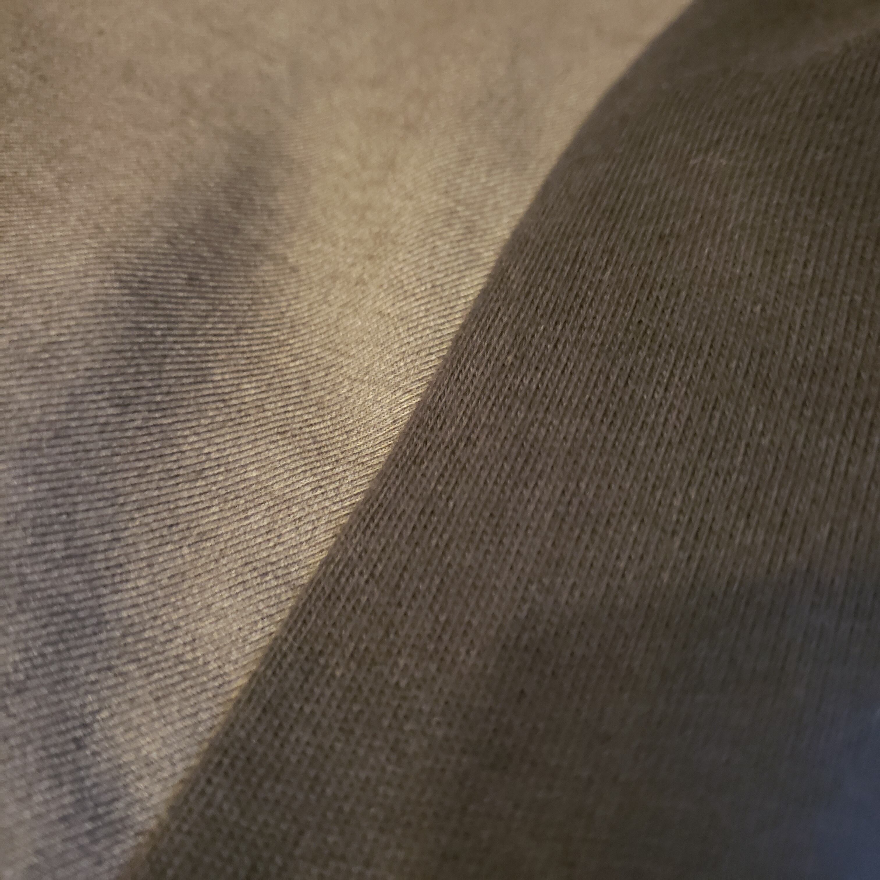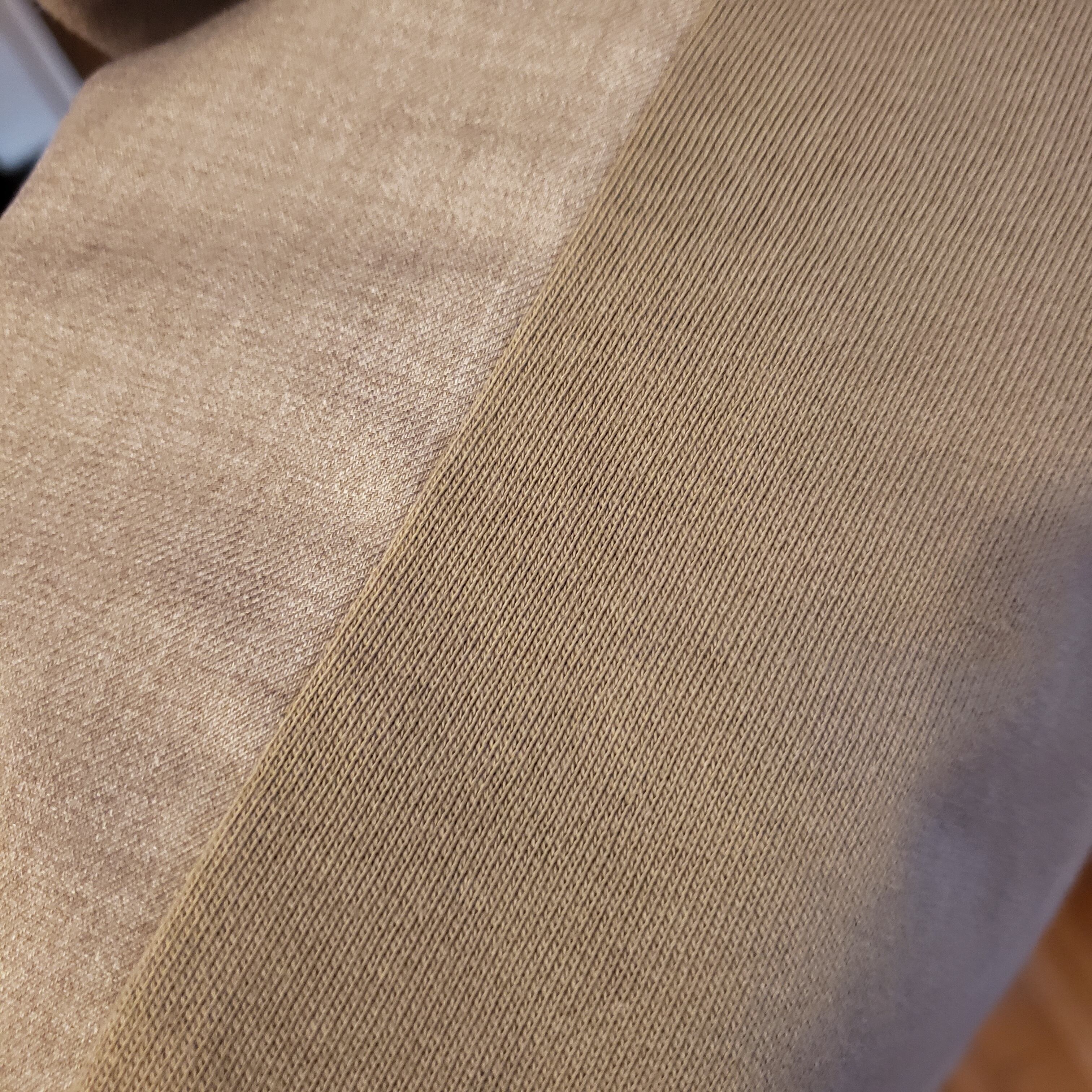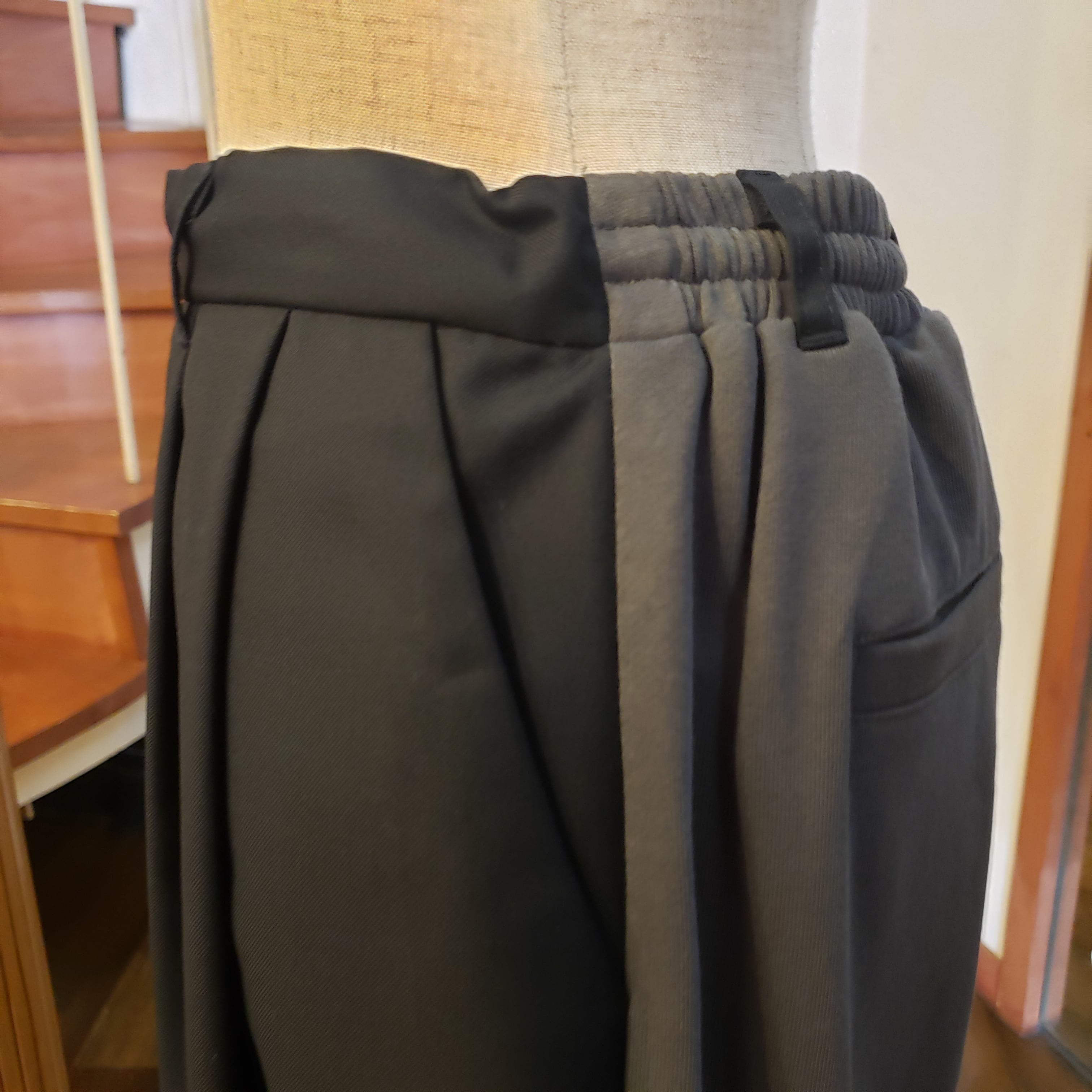 フロント部分は落ち感のあるポリエステル素材、バックスタイルは柔らかなジャージ素材です。