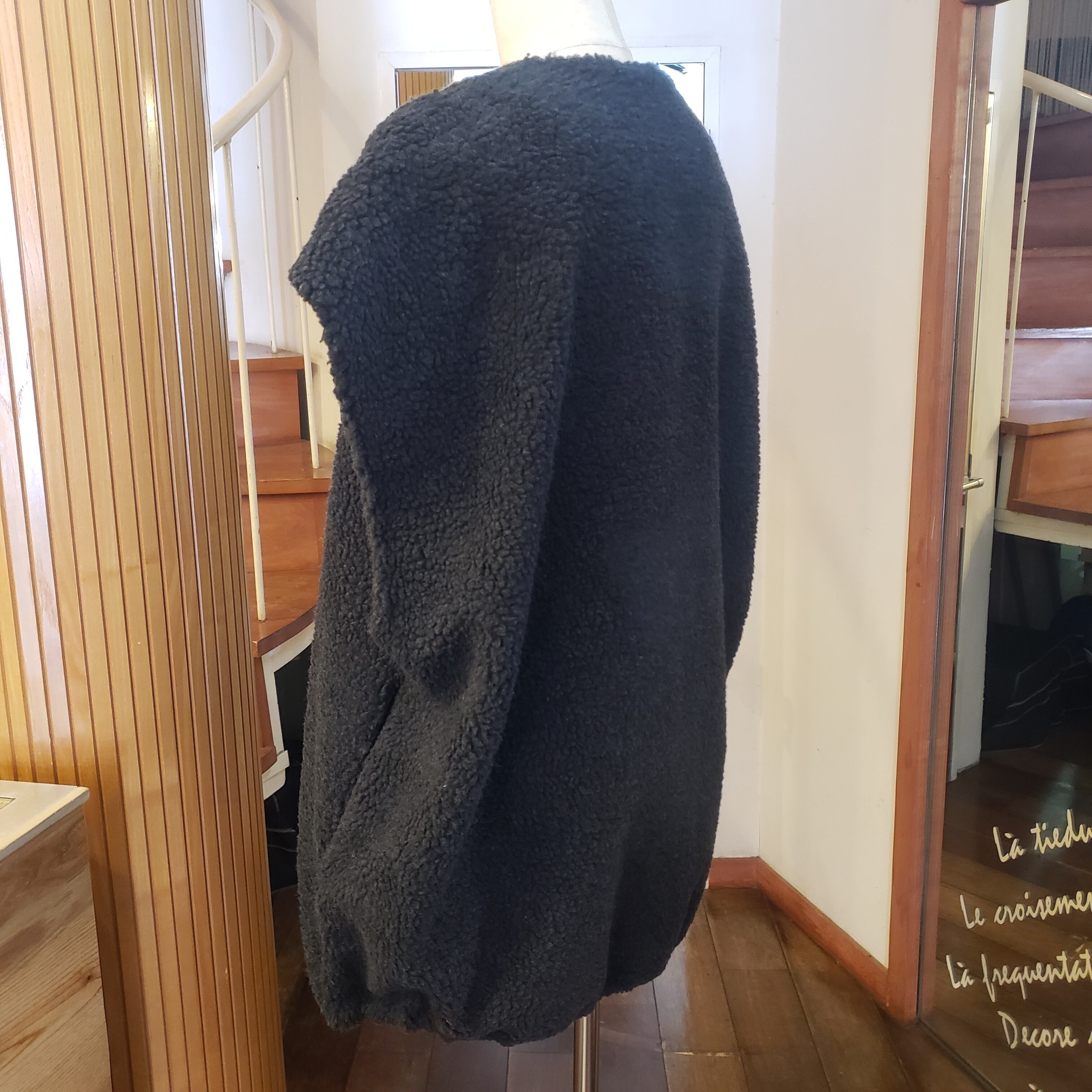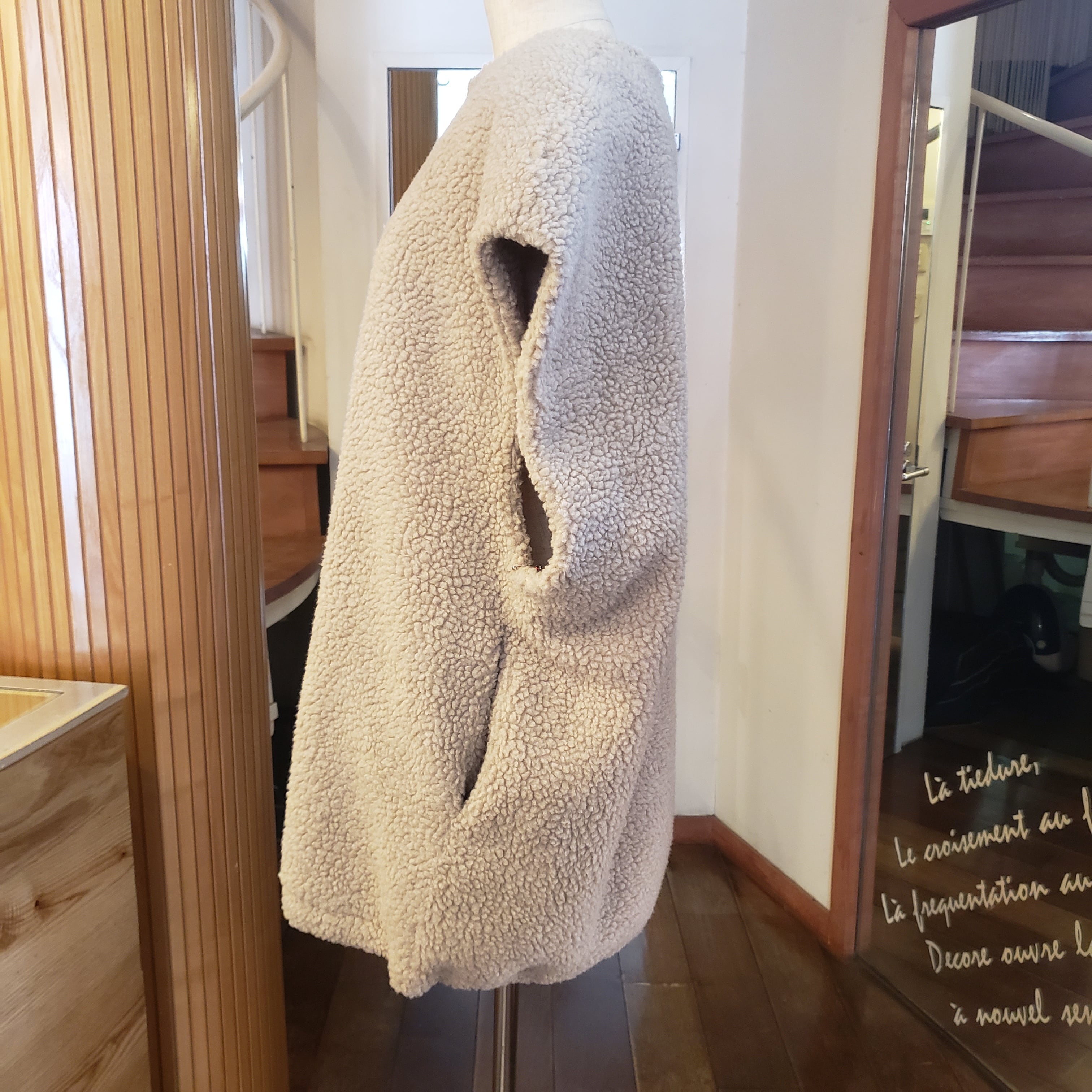 ゆったりとしたサイズ感で肩までかかる袖口、首回りはシンプルなノーカラーでレイヤードスタイルのバリエーションを楽しめます。