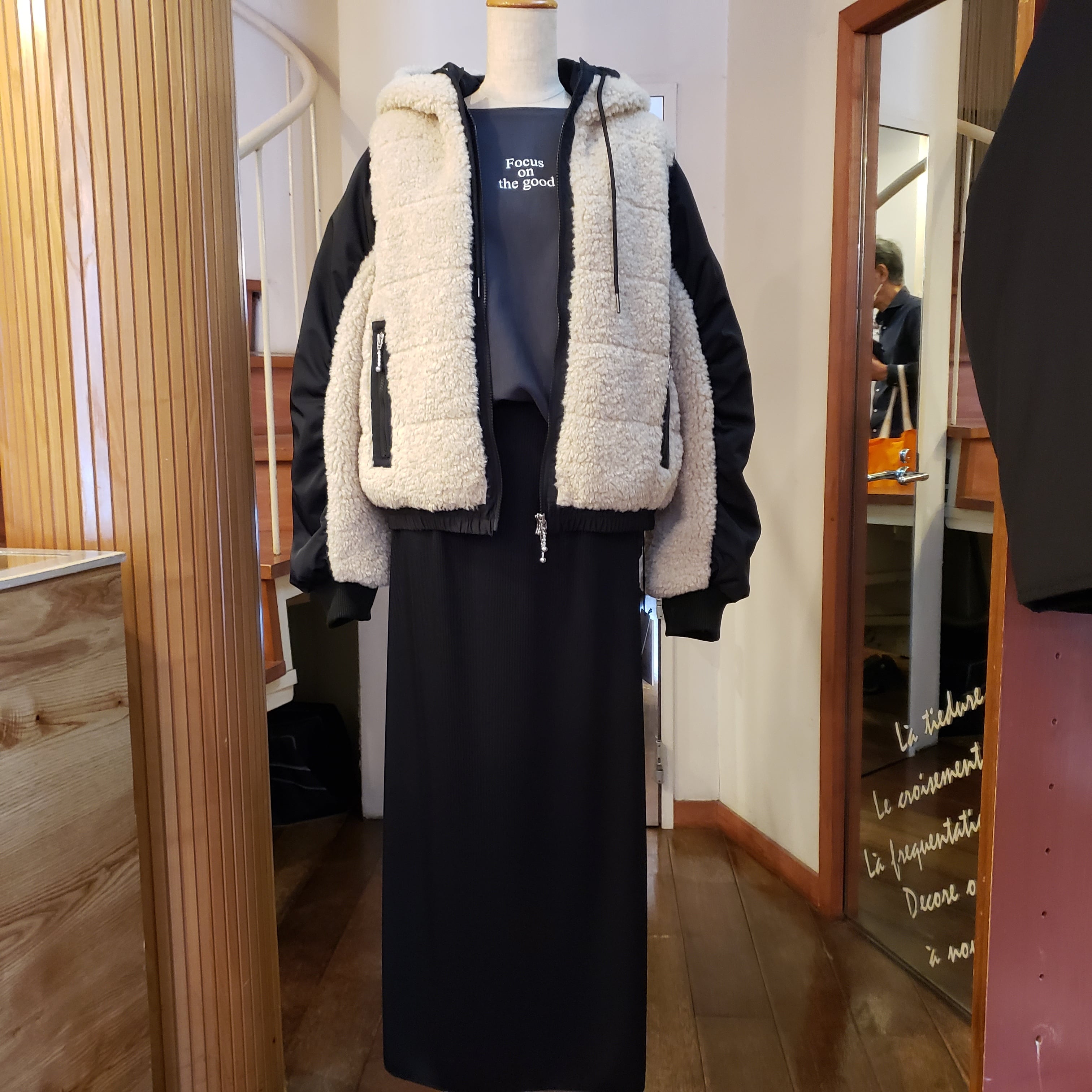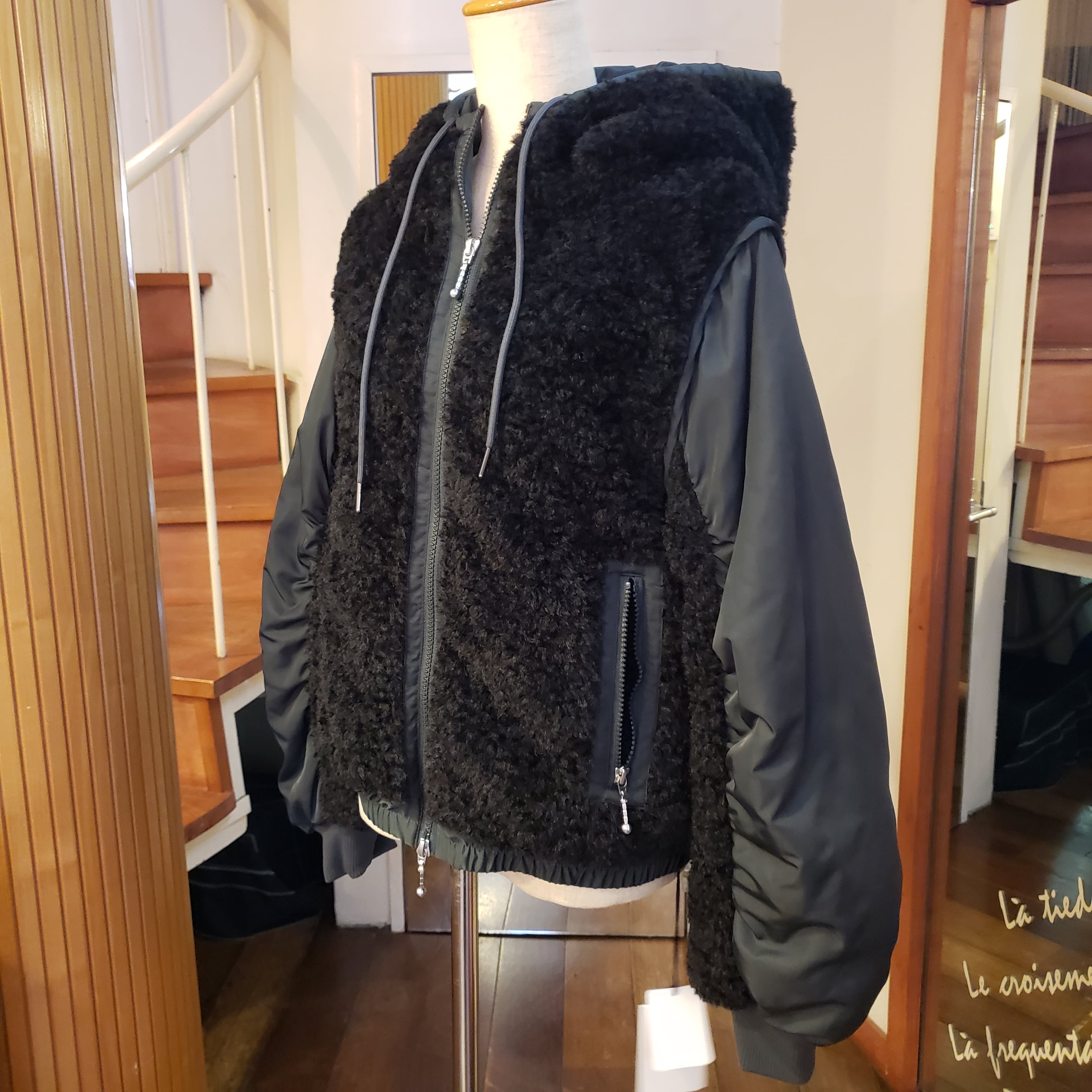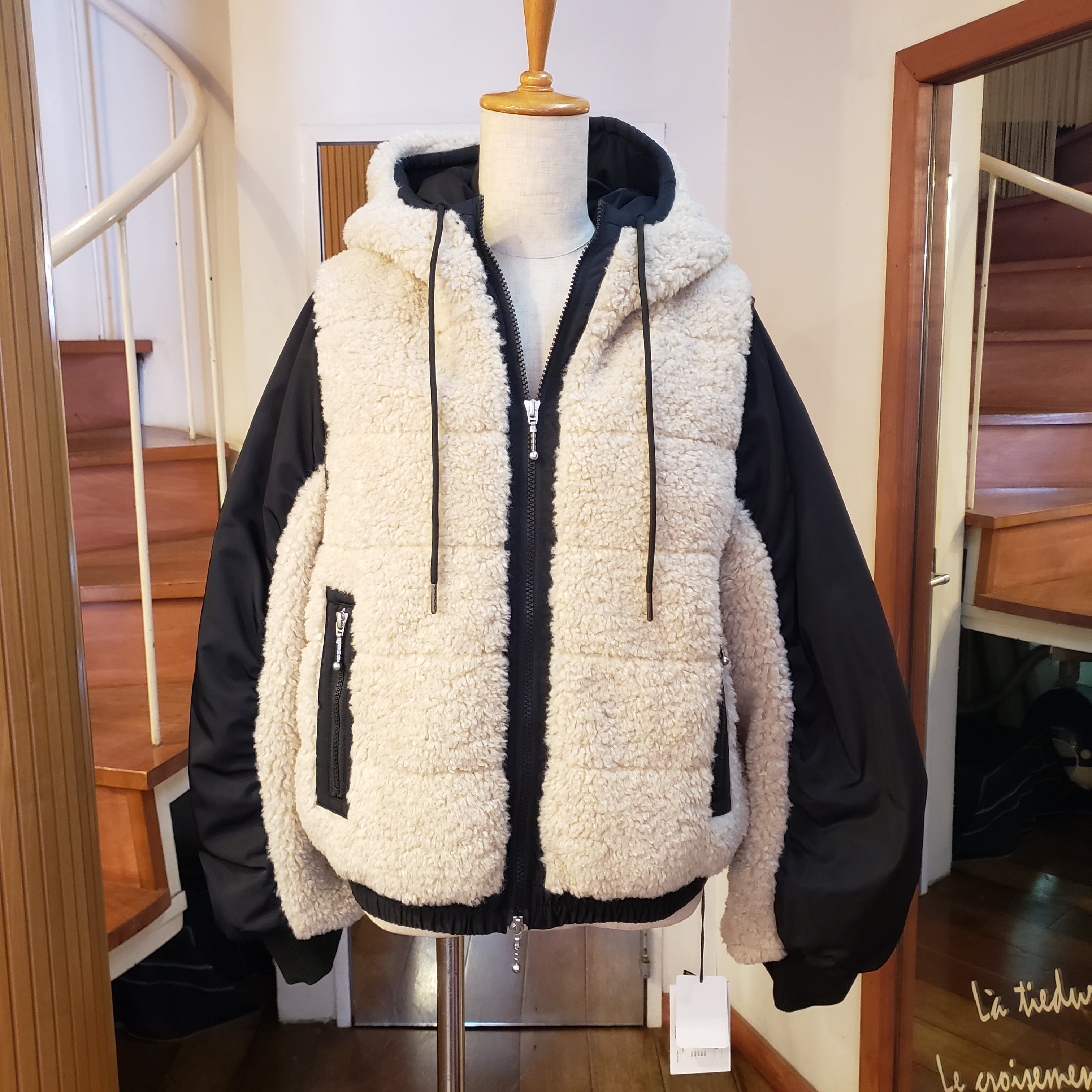 ボアの身頃に袖をキルト仕様のタフタ素材で切り替えたブルゾン。