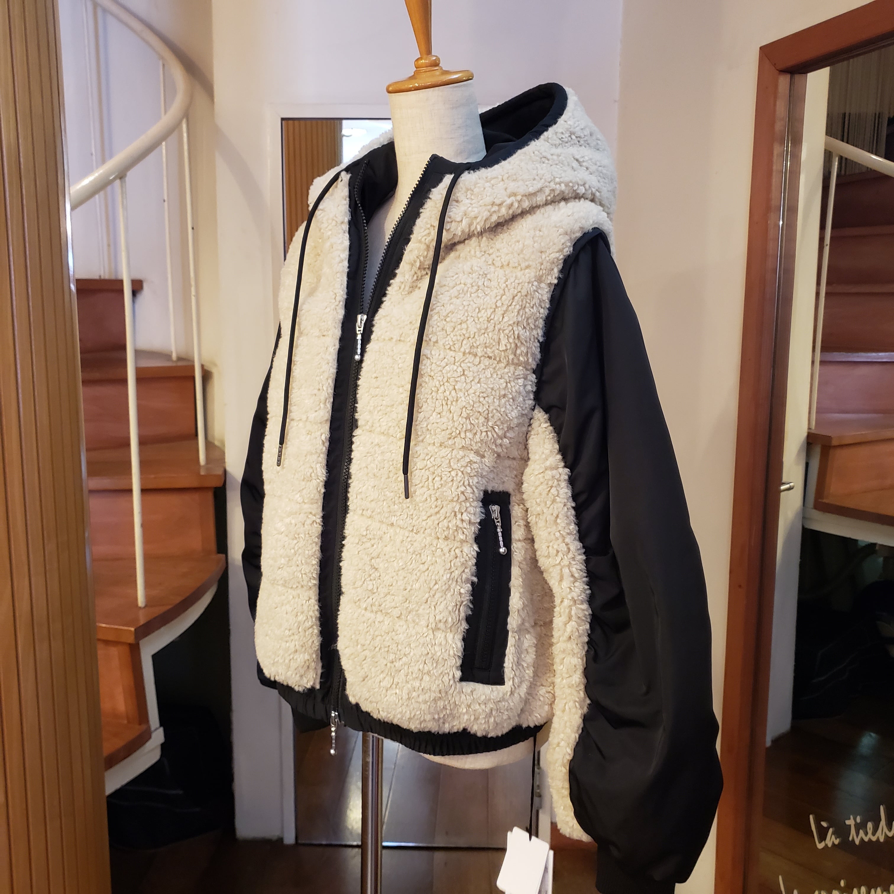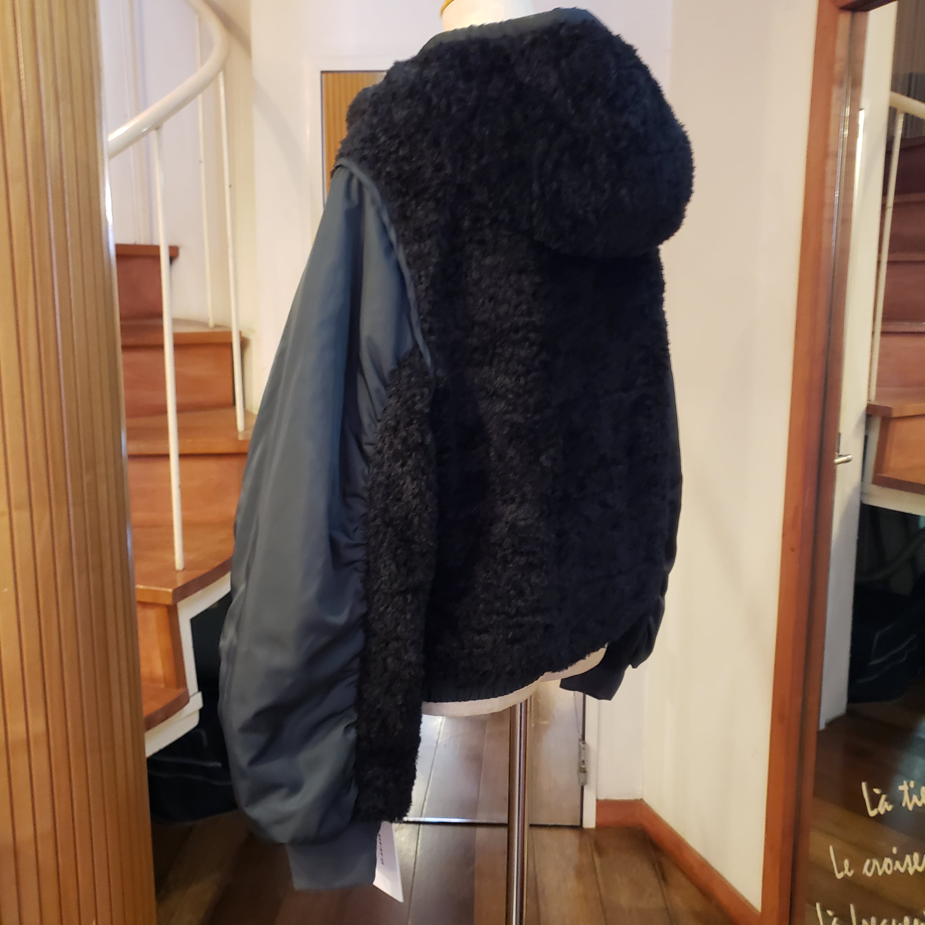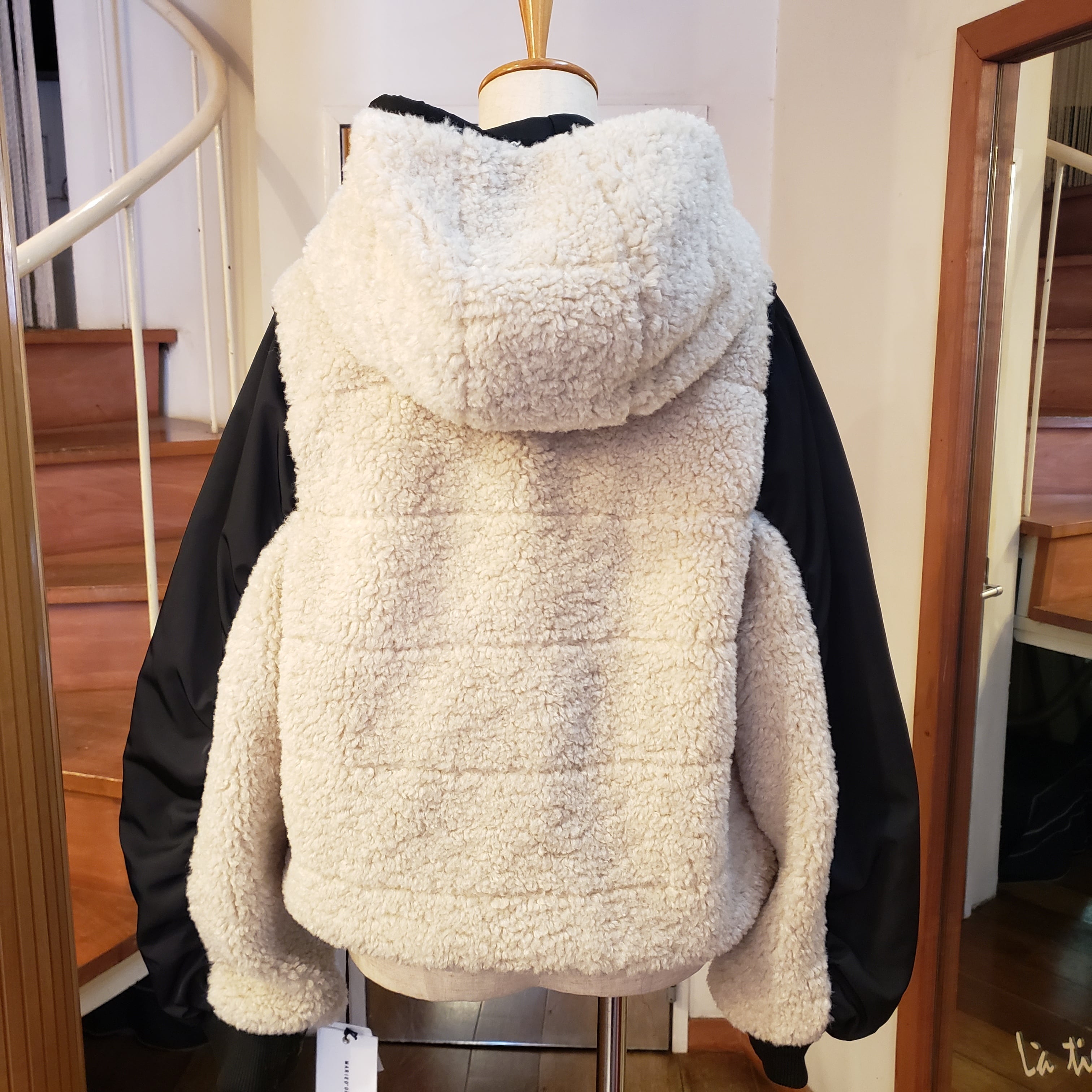 ボアの身頃に袖をキルト仕様のタフタ素材で切り替えたブルゾン。