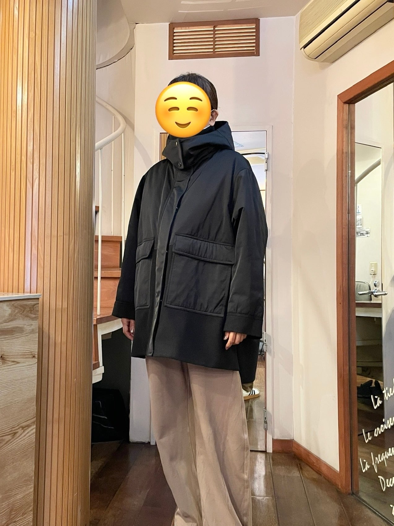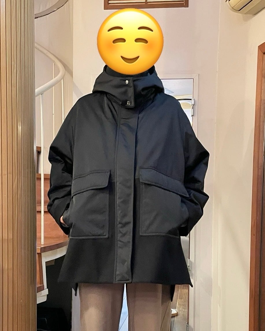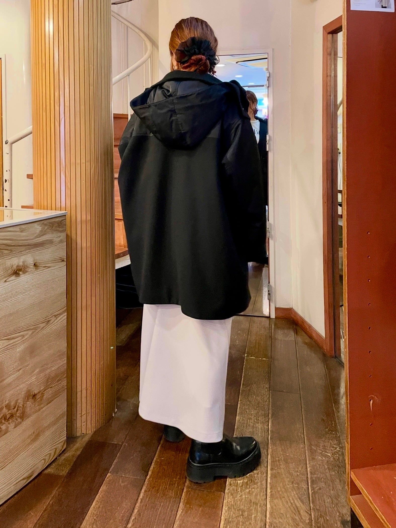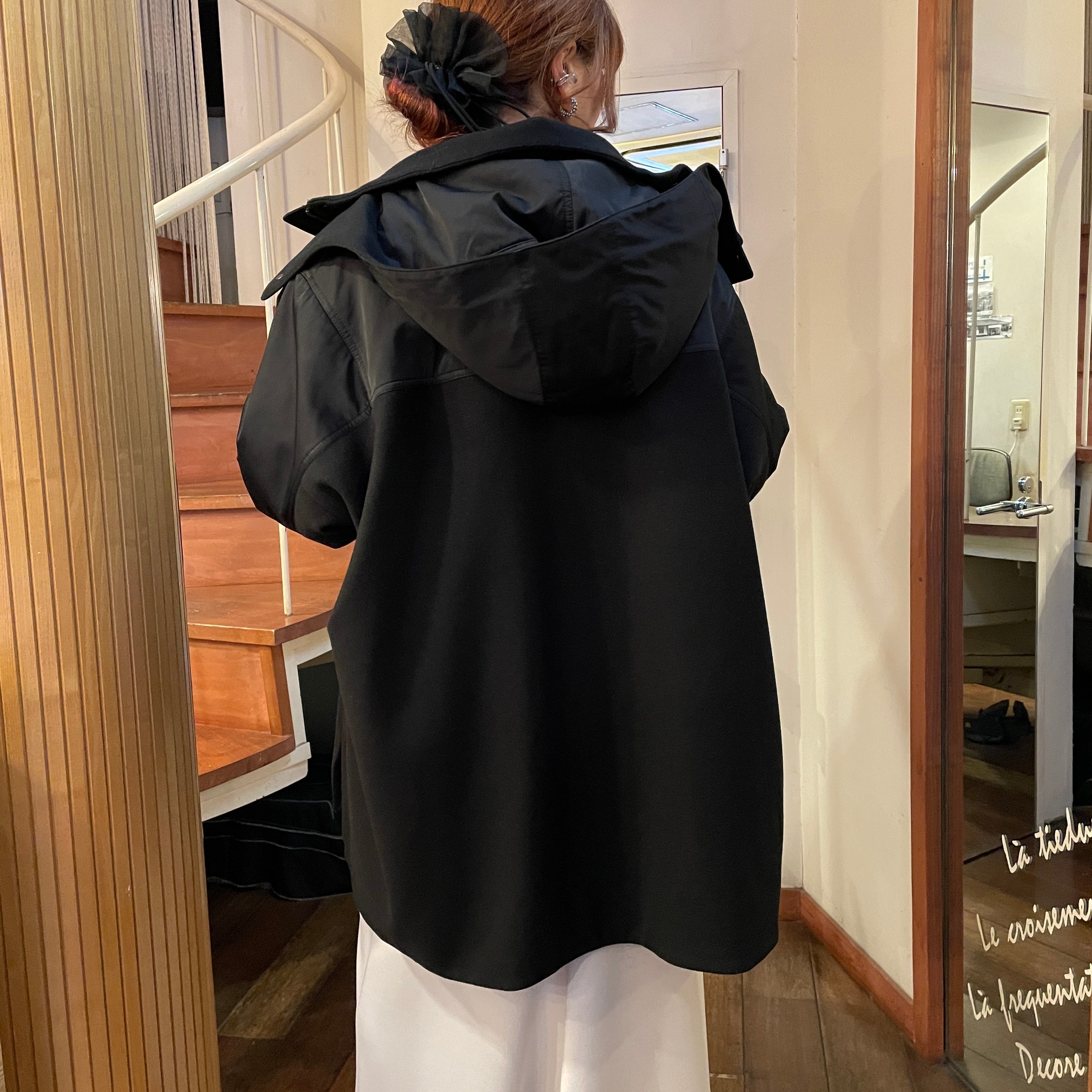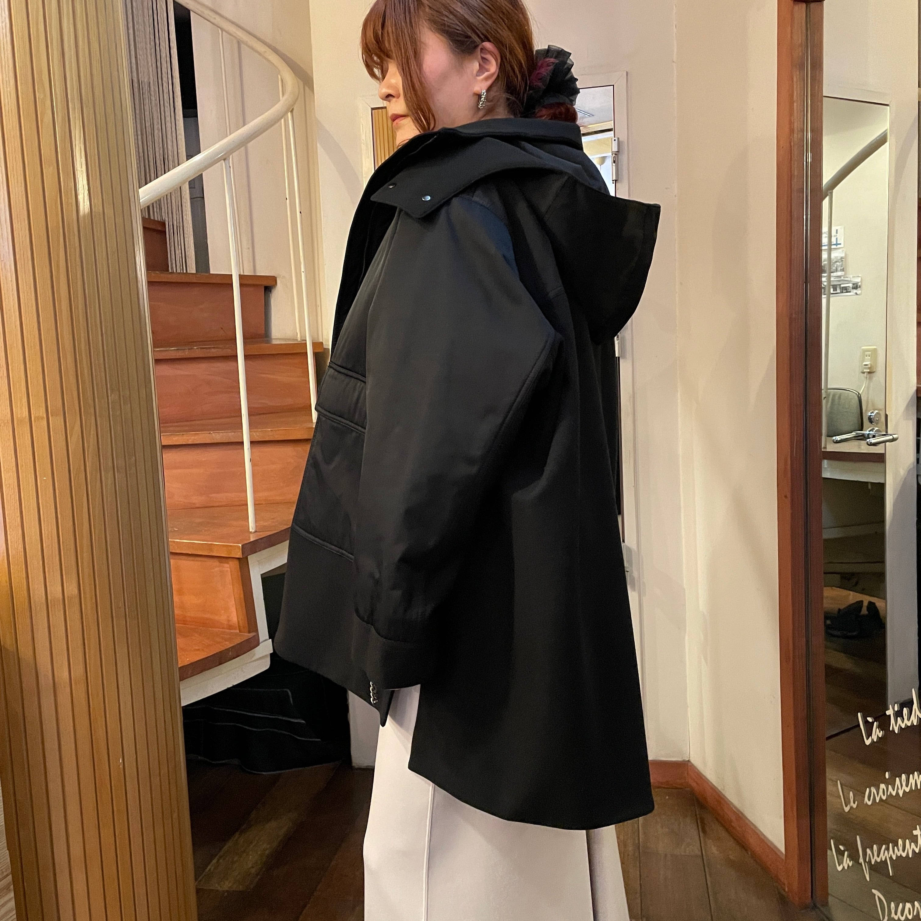 フード付きで一見カジュアルな印象ながら、切替デザインとAラインシルエットが
