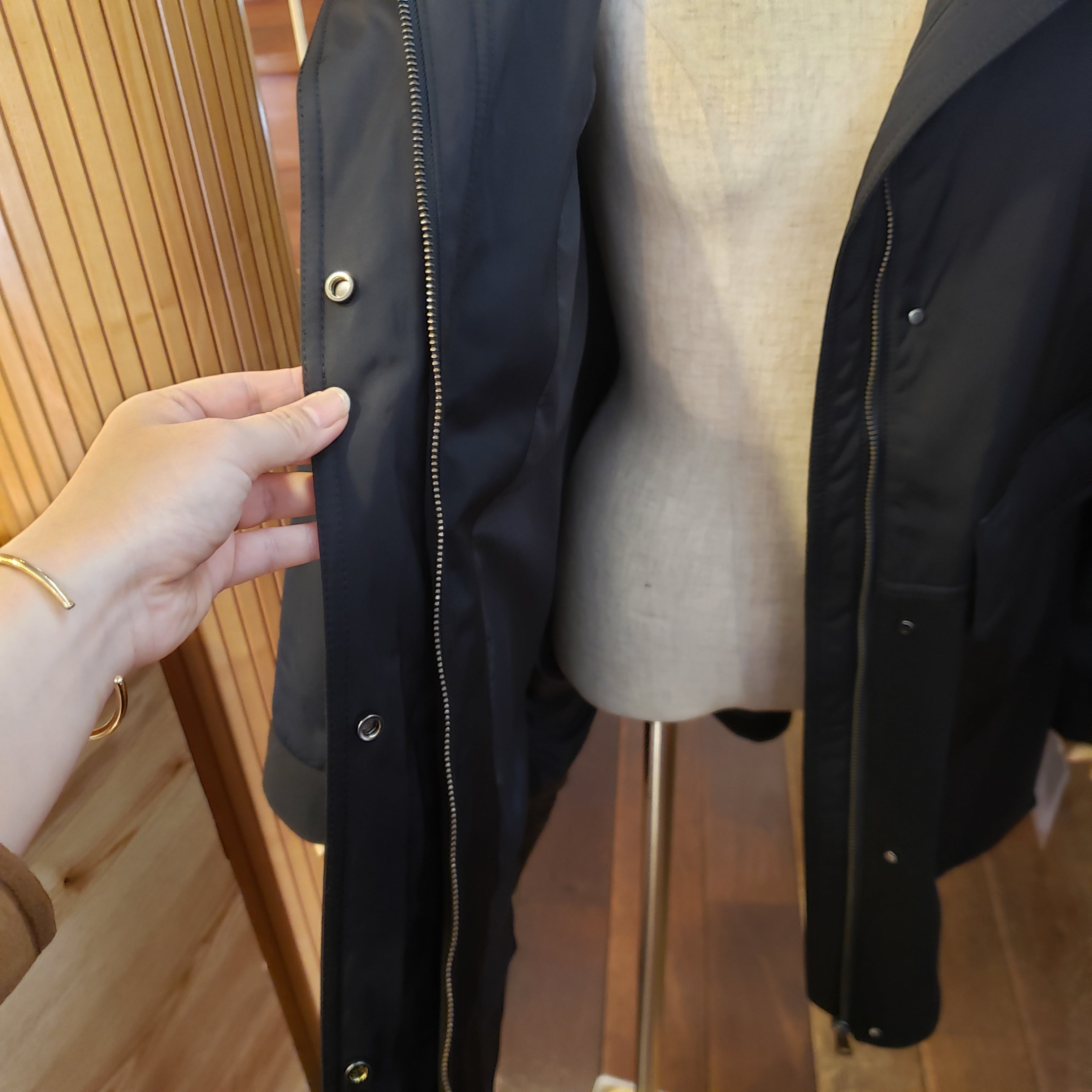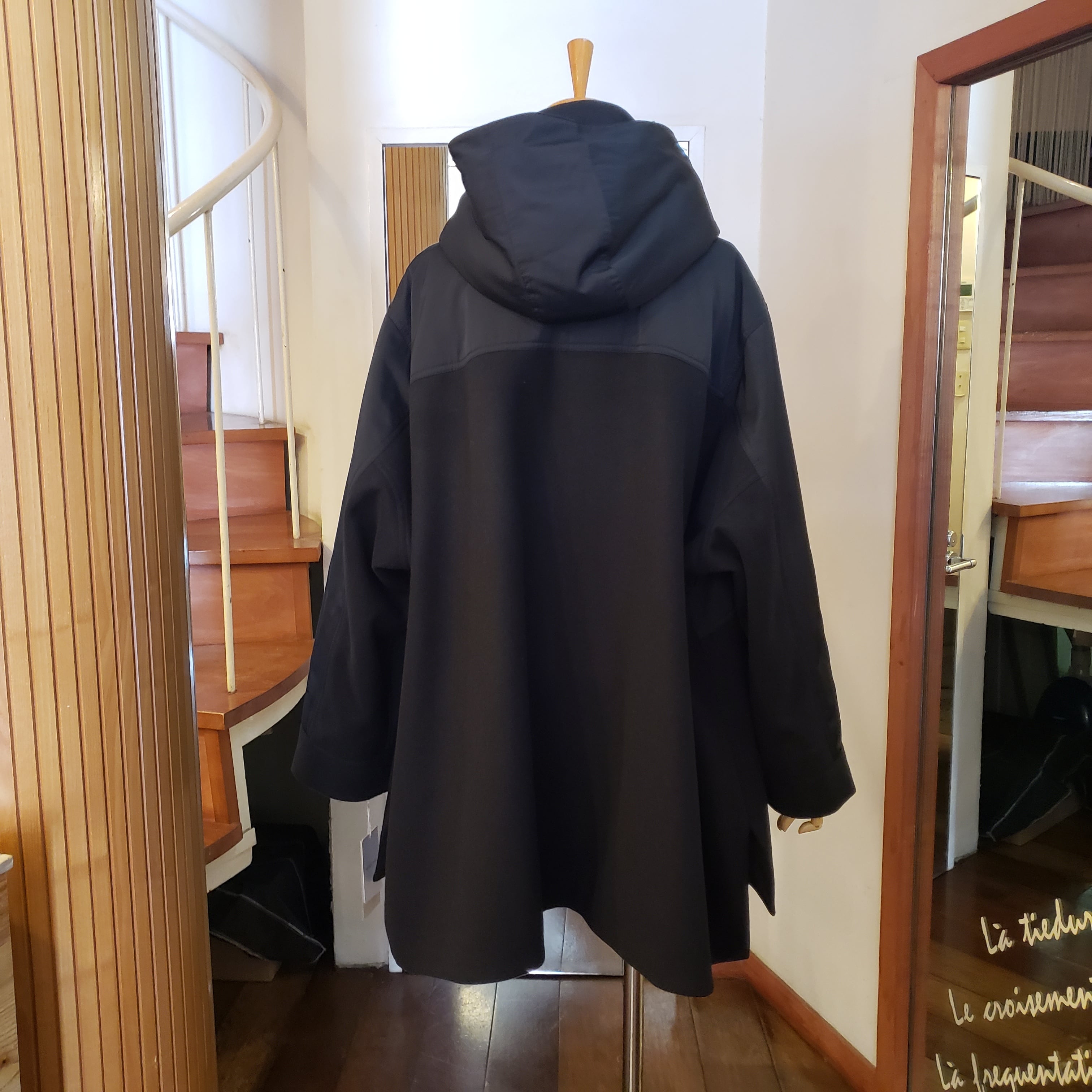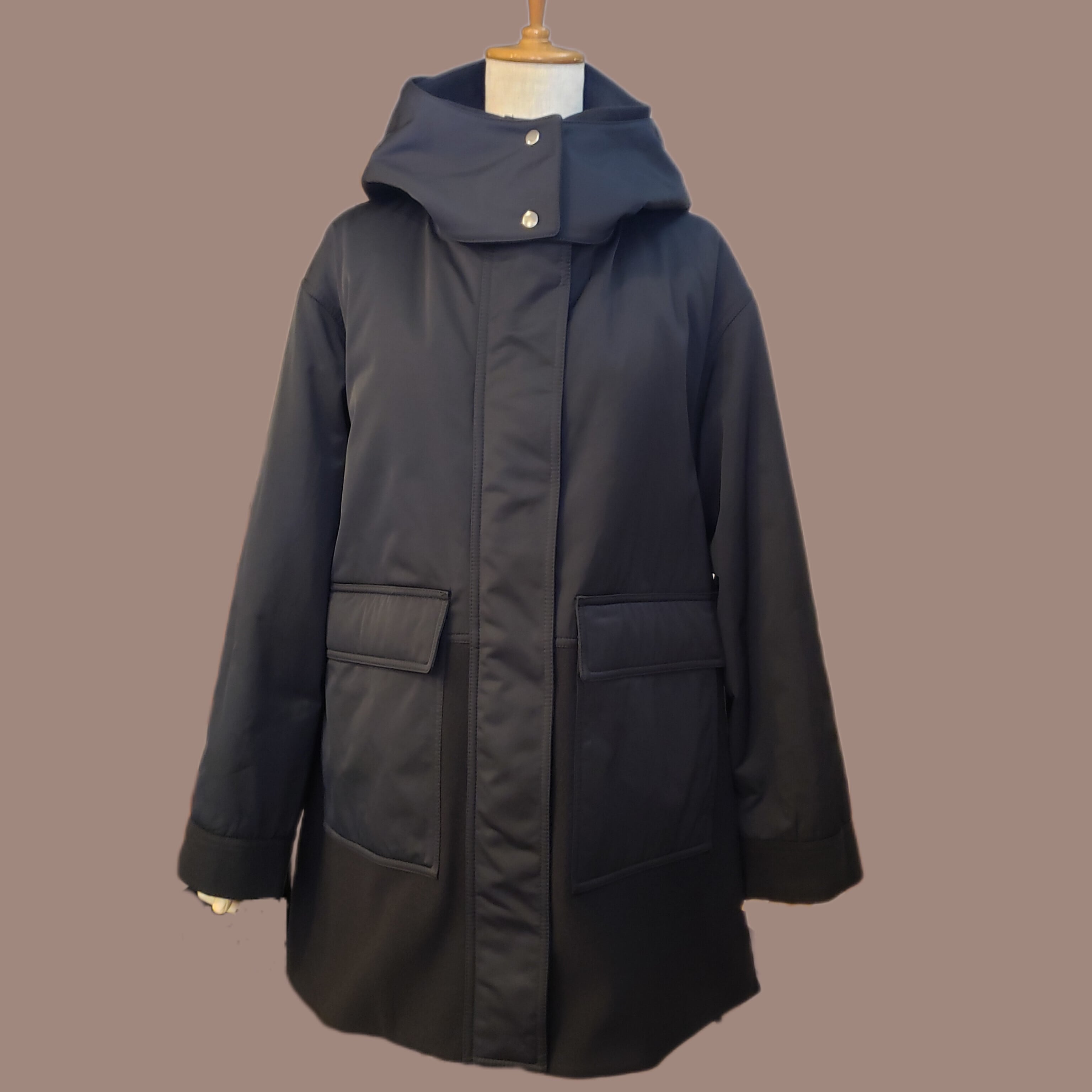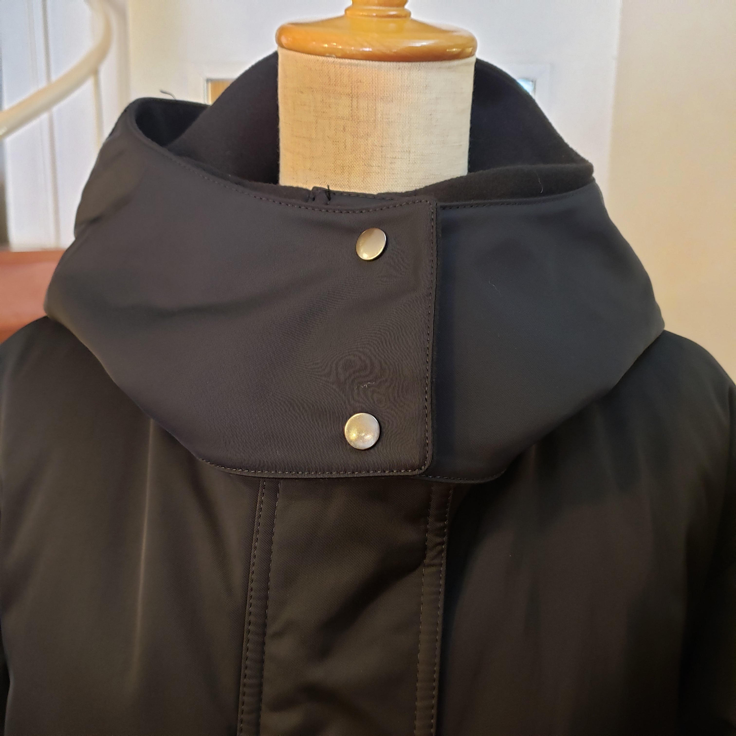 フード付きで一見カジュアルな印象ながら、切替デザインとAラインシルエットが
