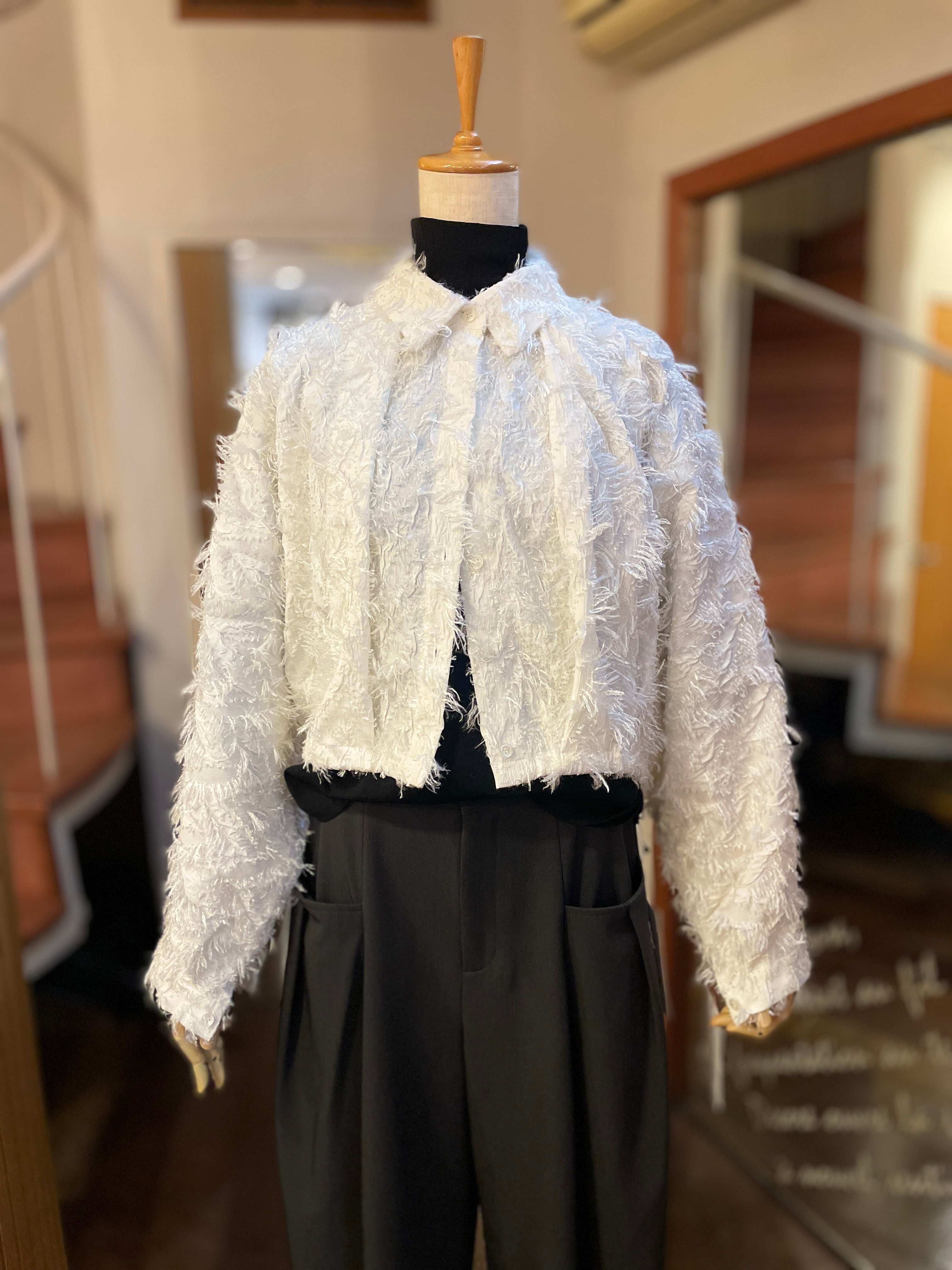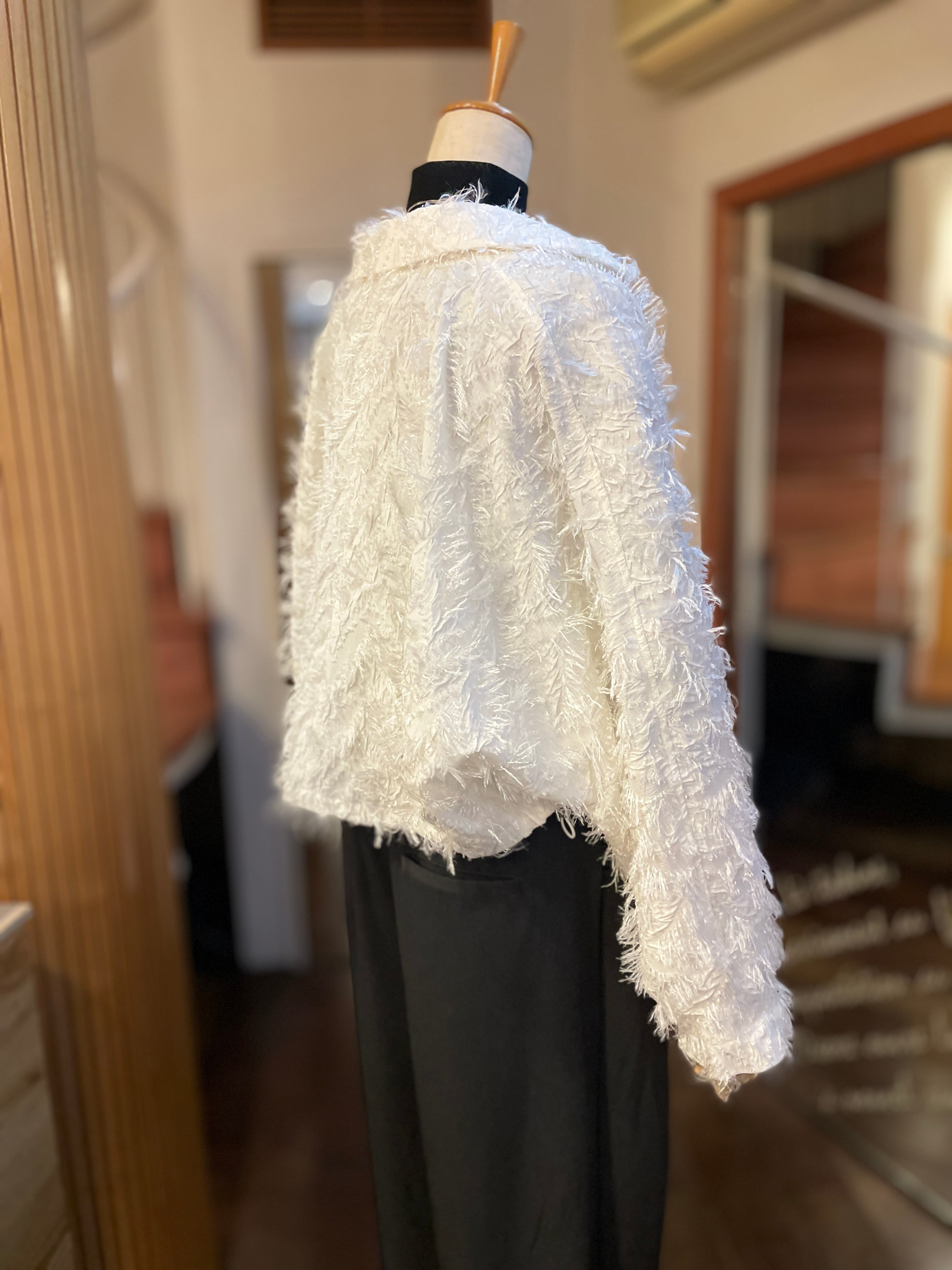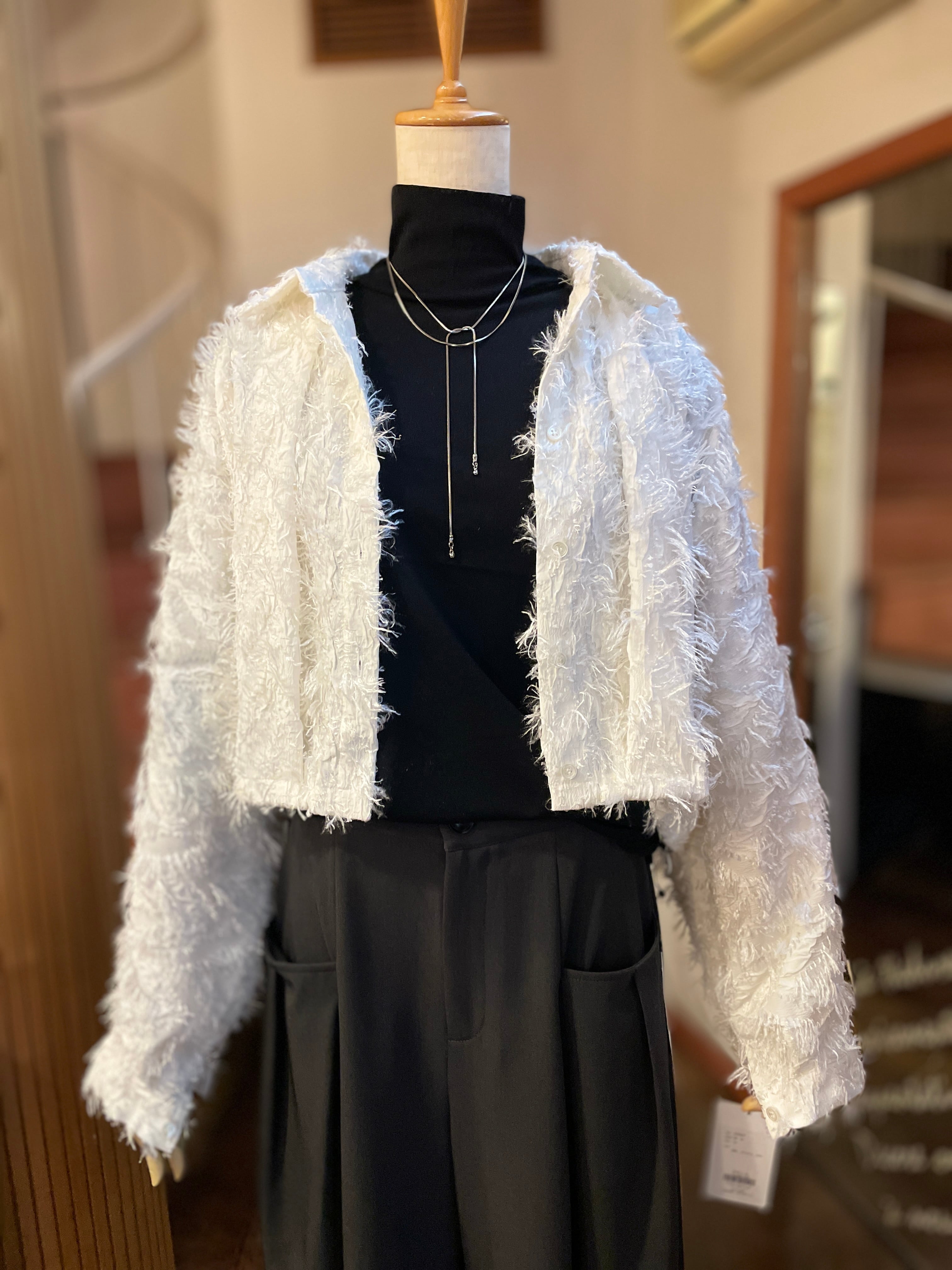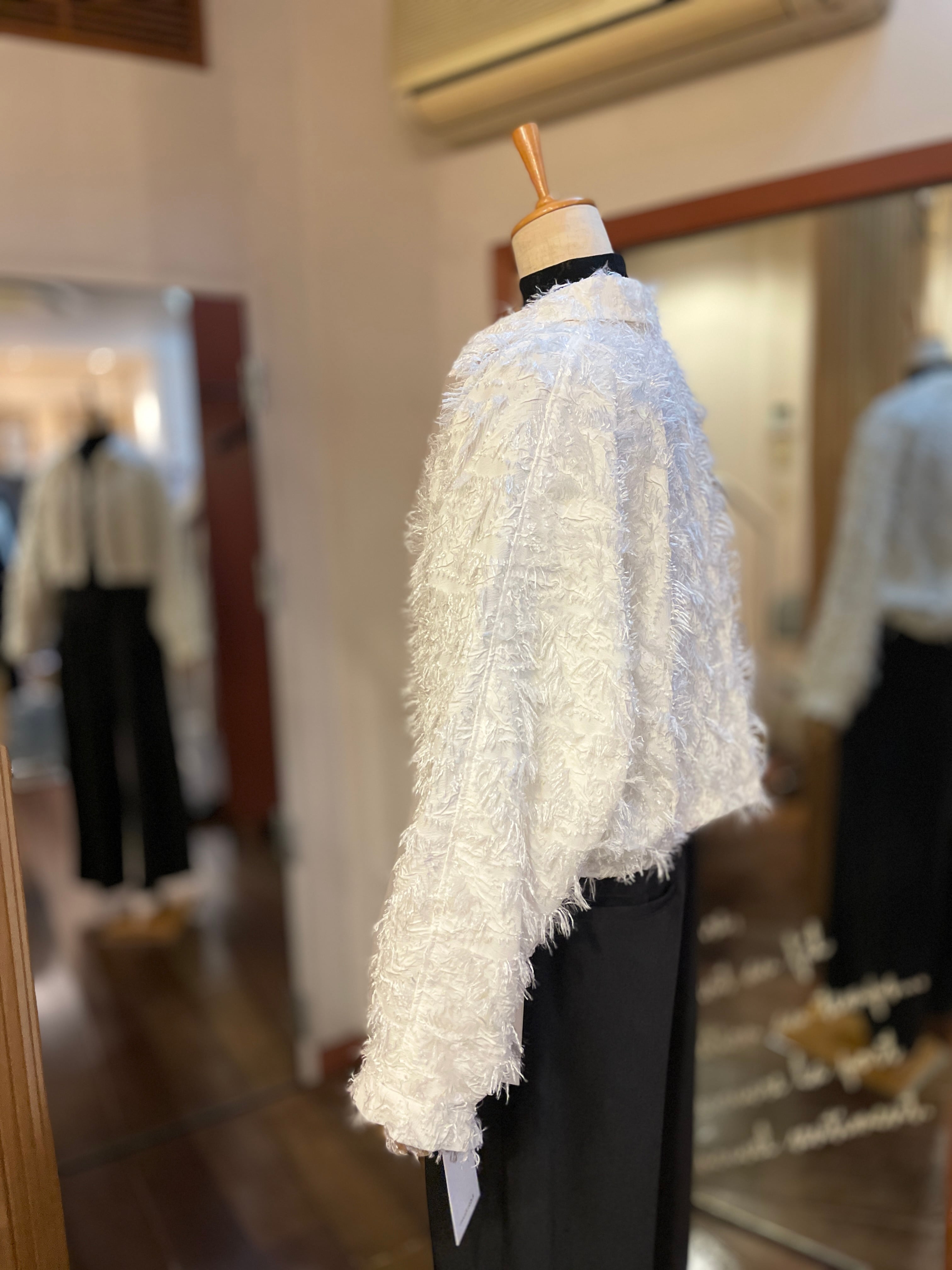 華やかなフリンジジャガードは一枚でも羽織アイテムとしても重宝します。