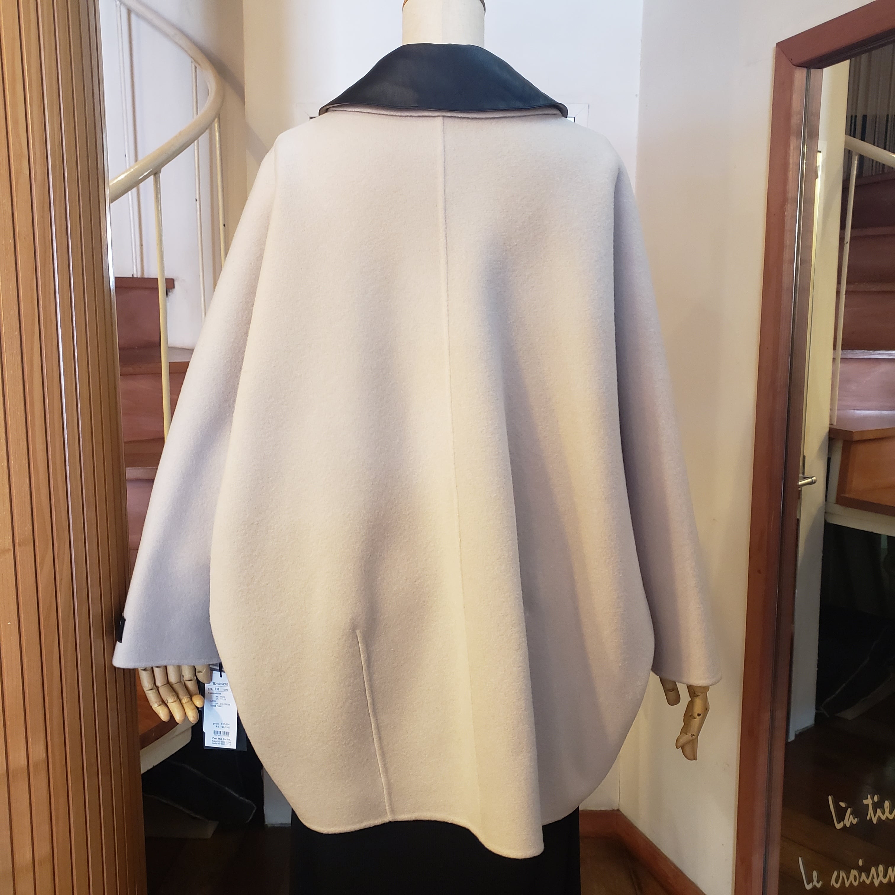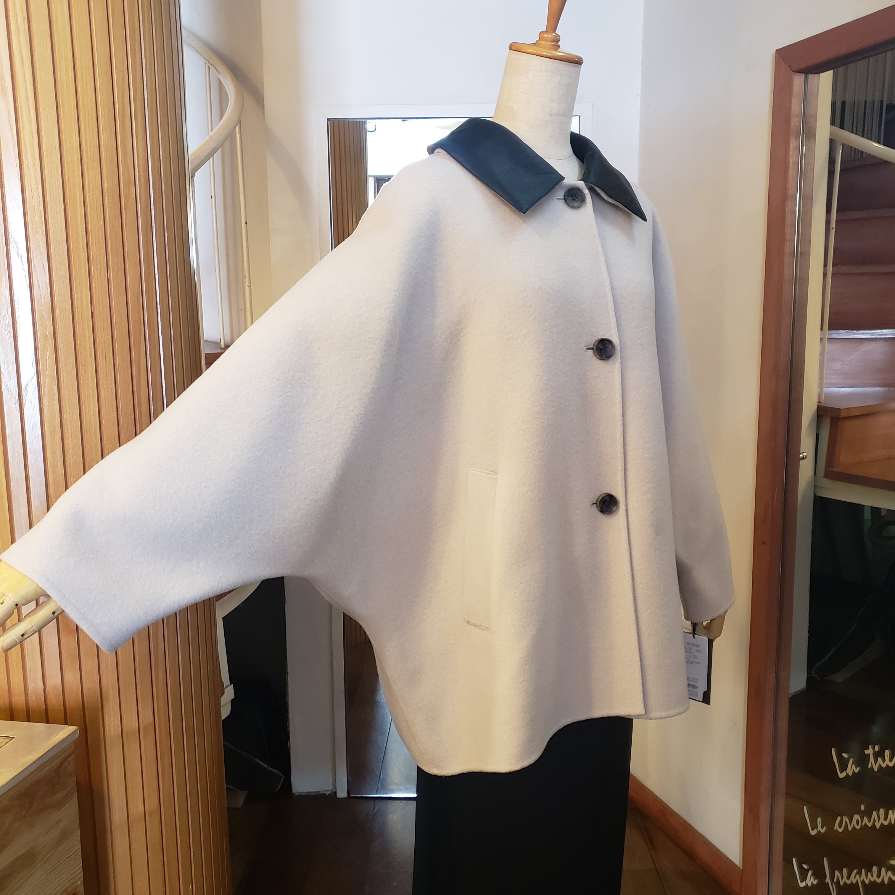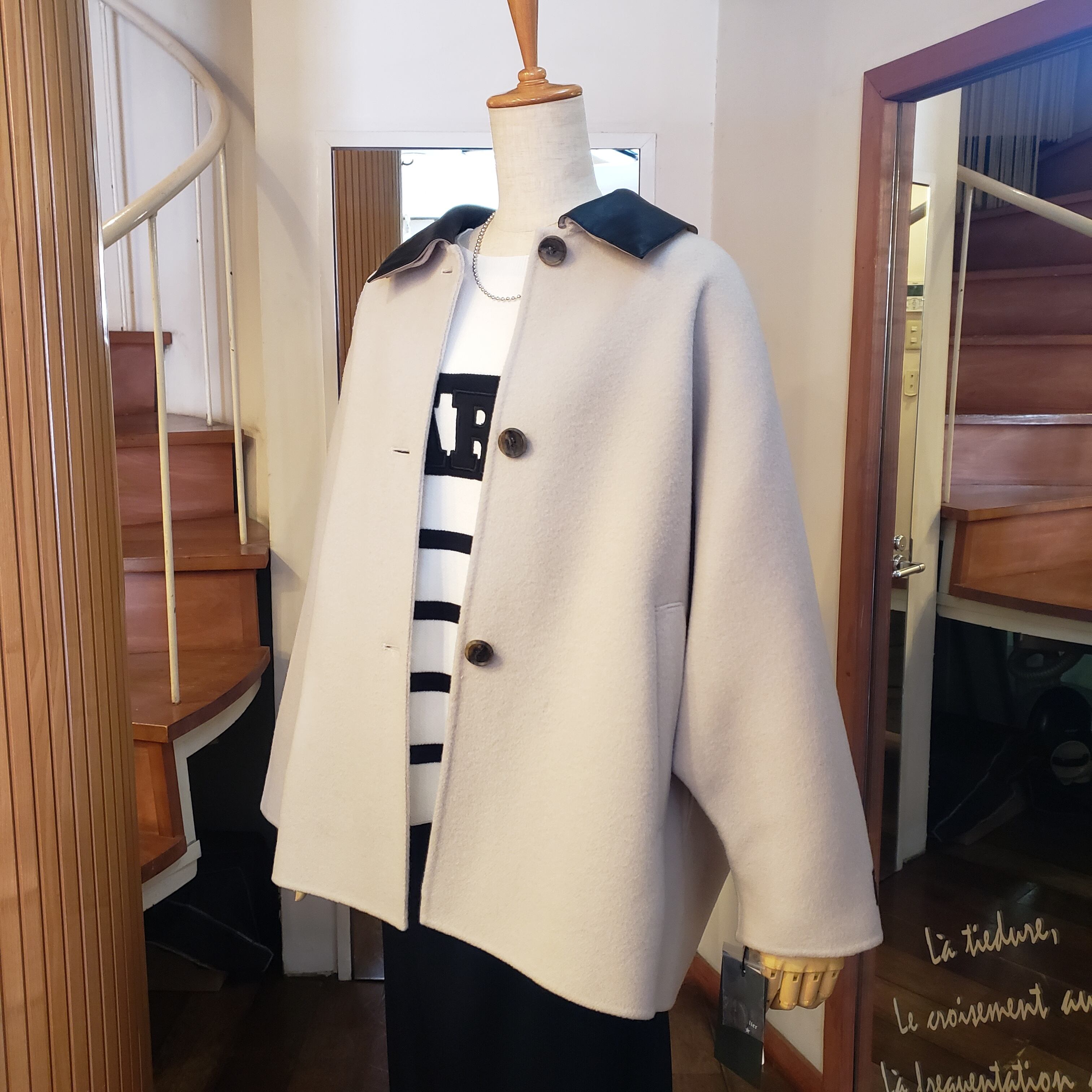 ゆったりしたドルマンスリーブで襟先に付いた配色レザーもポイント!