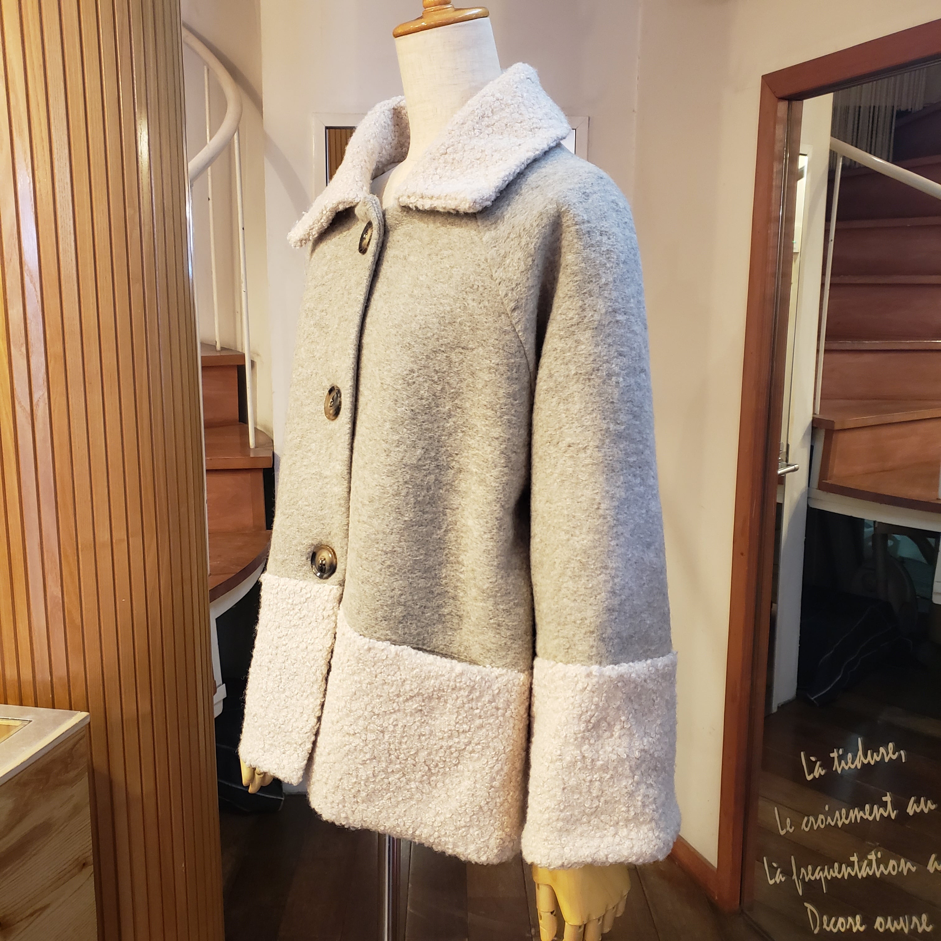襟、袖口、裾回りをブークレ素材で切り替えた圧縮ウールのアウターです。