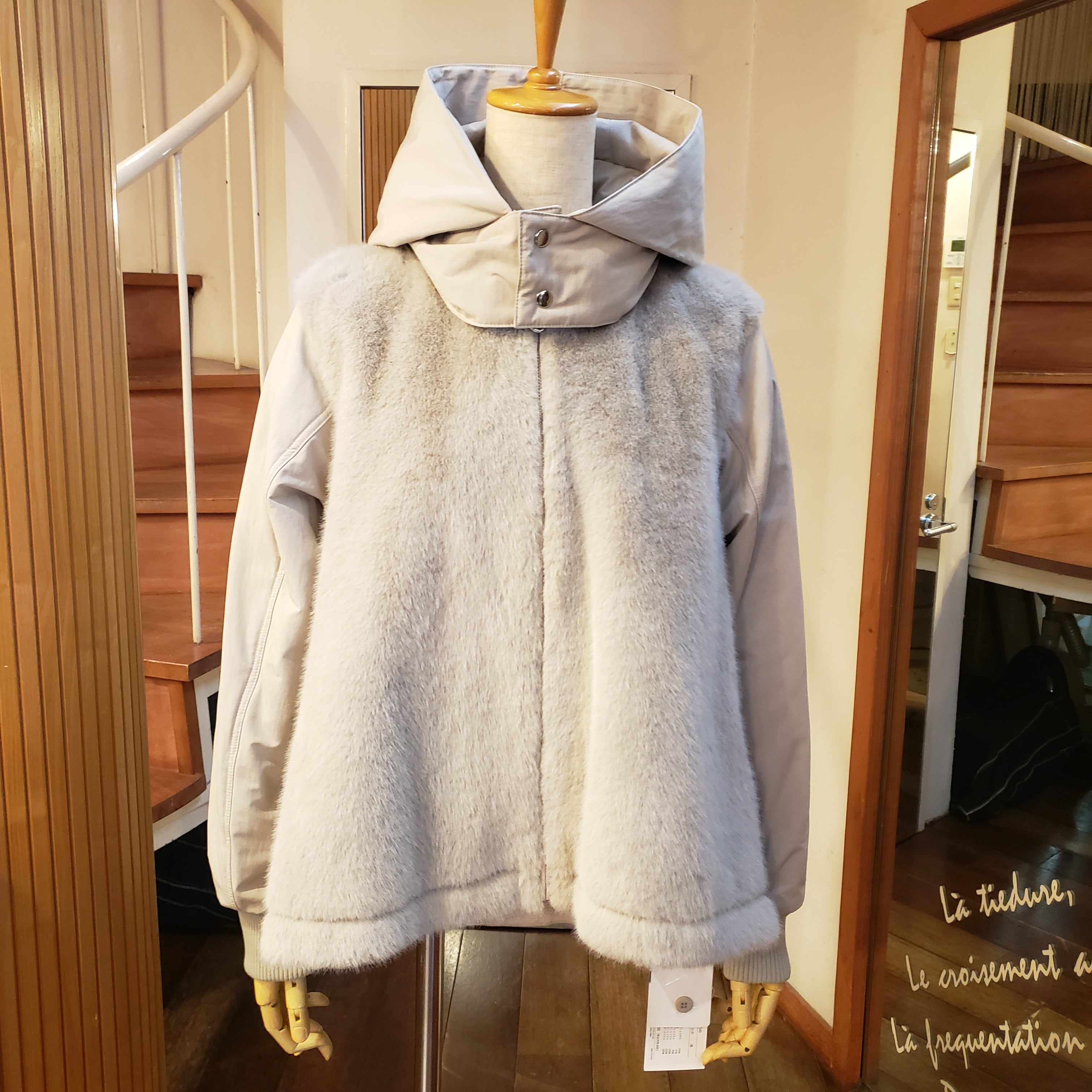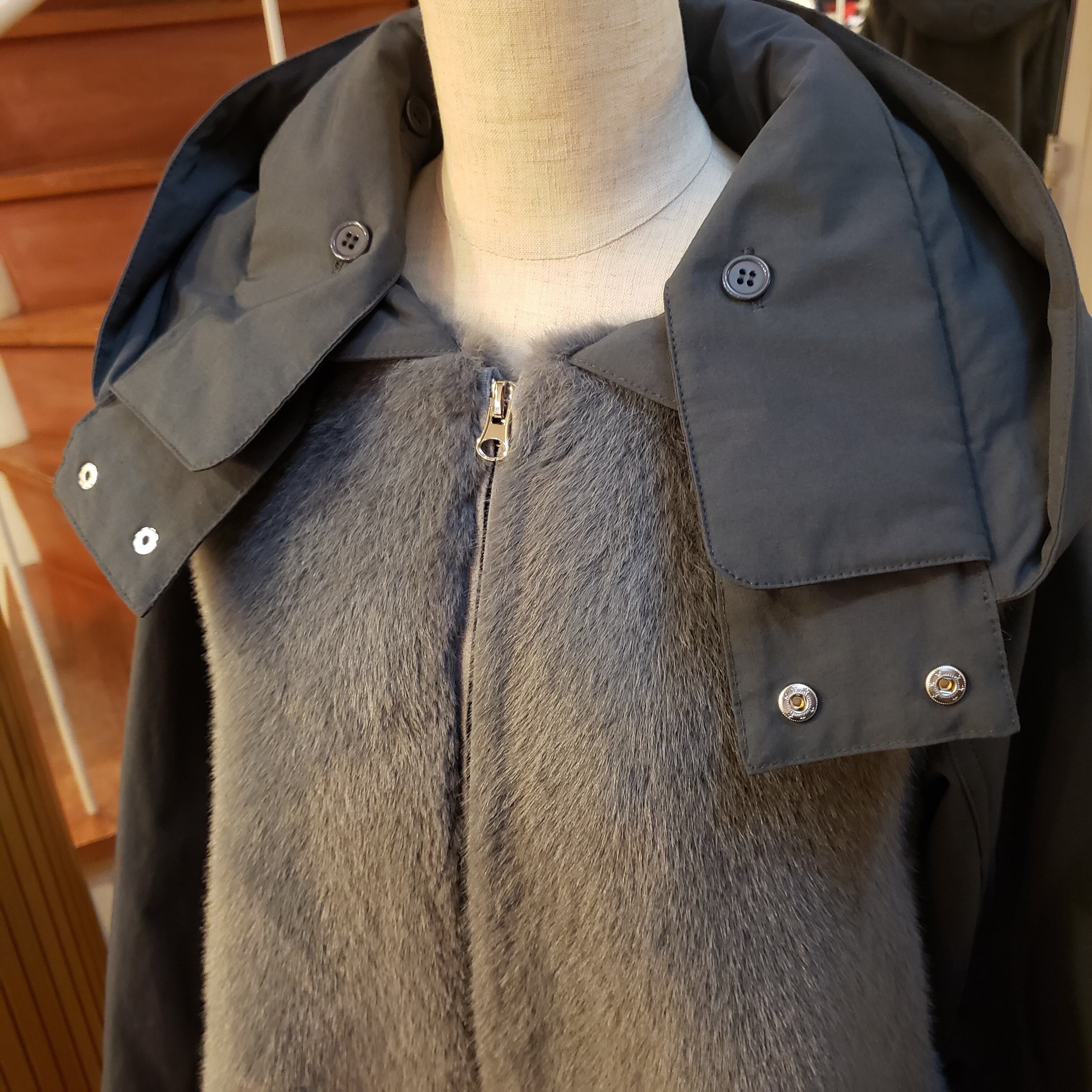 襟、袖、フードは綿ポリのしっかりと張り感のある素材で、ファーとの切替が引き立ちます。