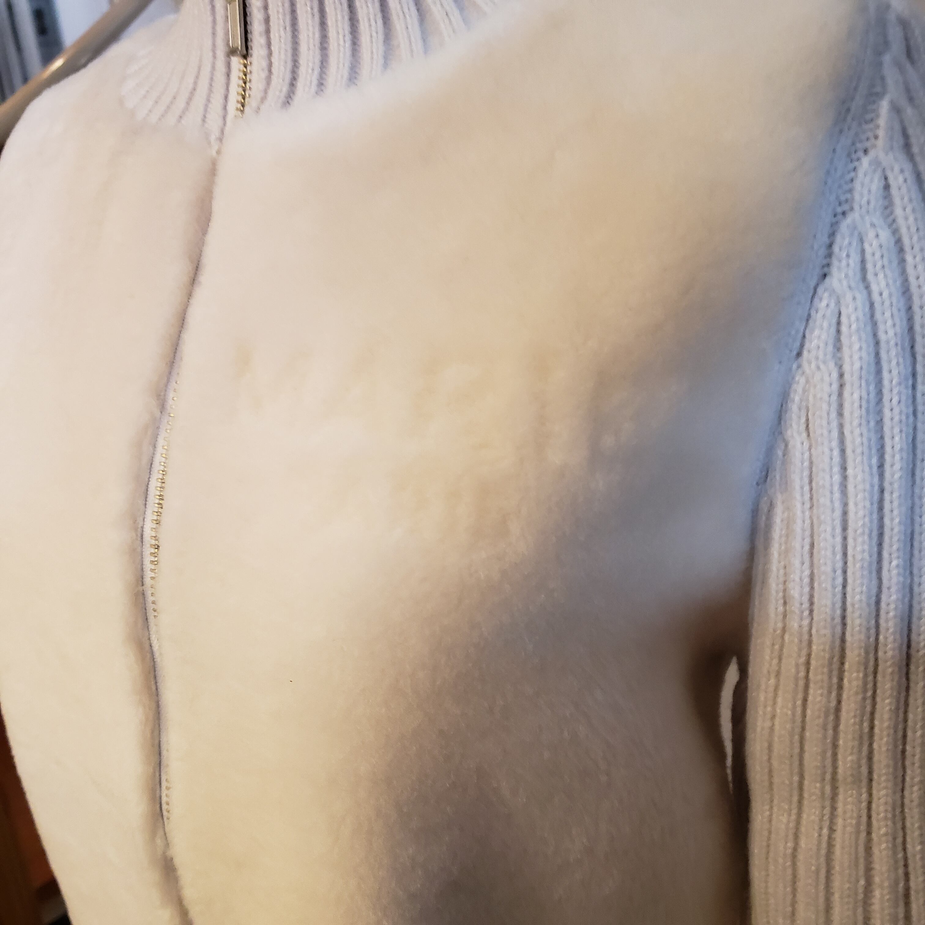 前身頃がリアルムートン、袖から背中にかけてはリブニットのデザインです。