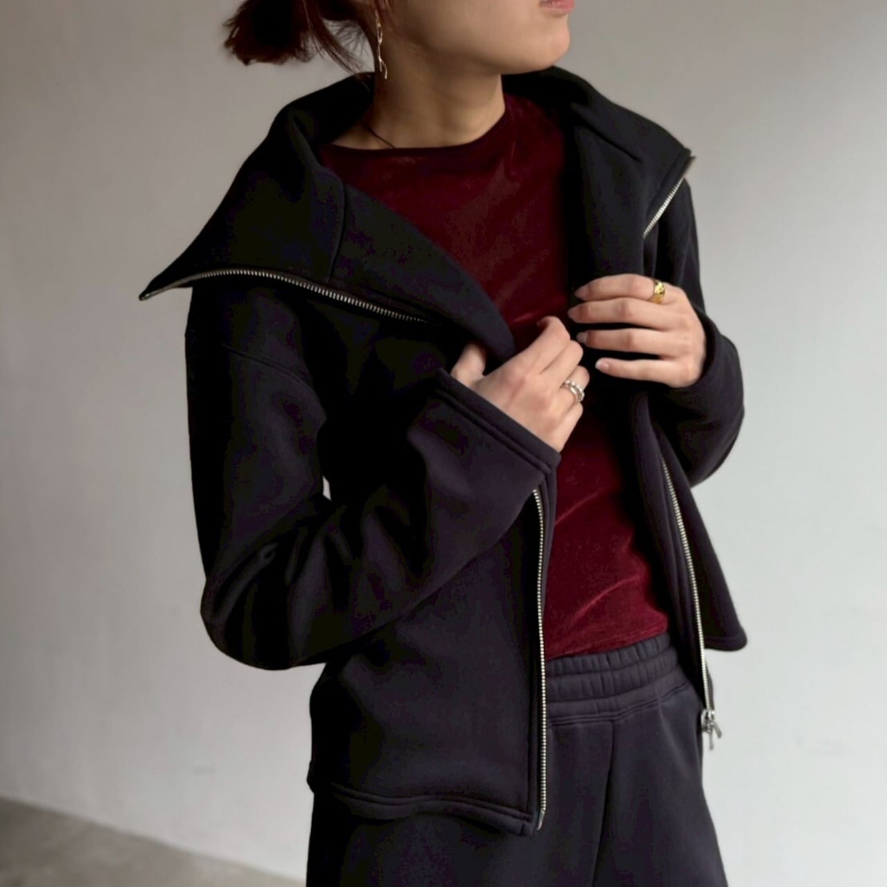 襟を高めにとったデザインでジップの留め位置次第でスタンドカラー風にも◎