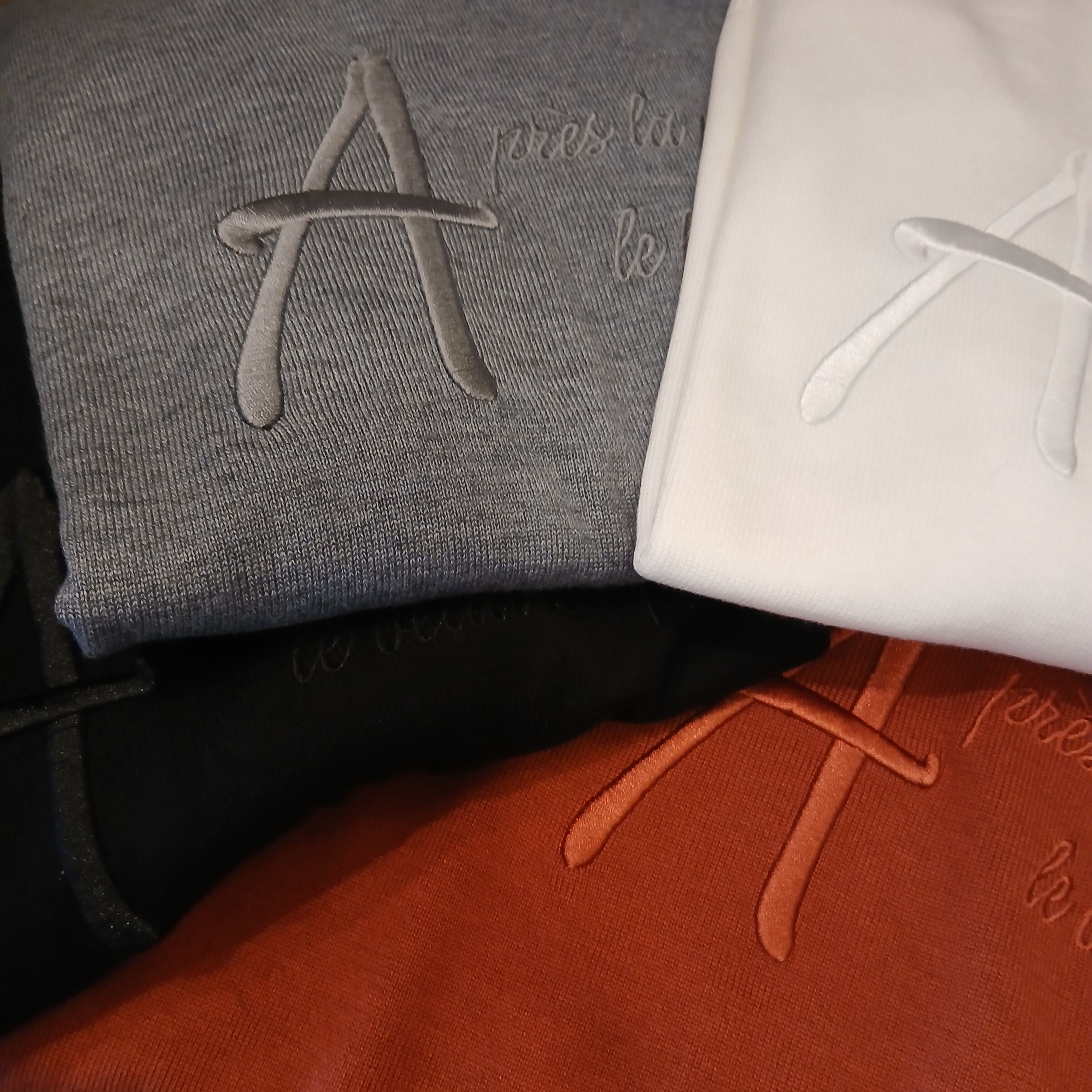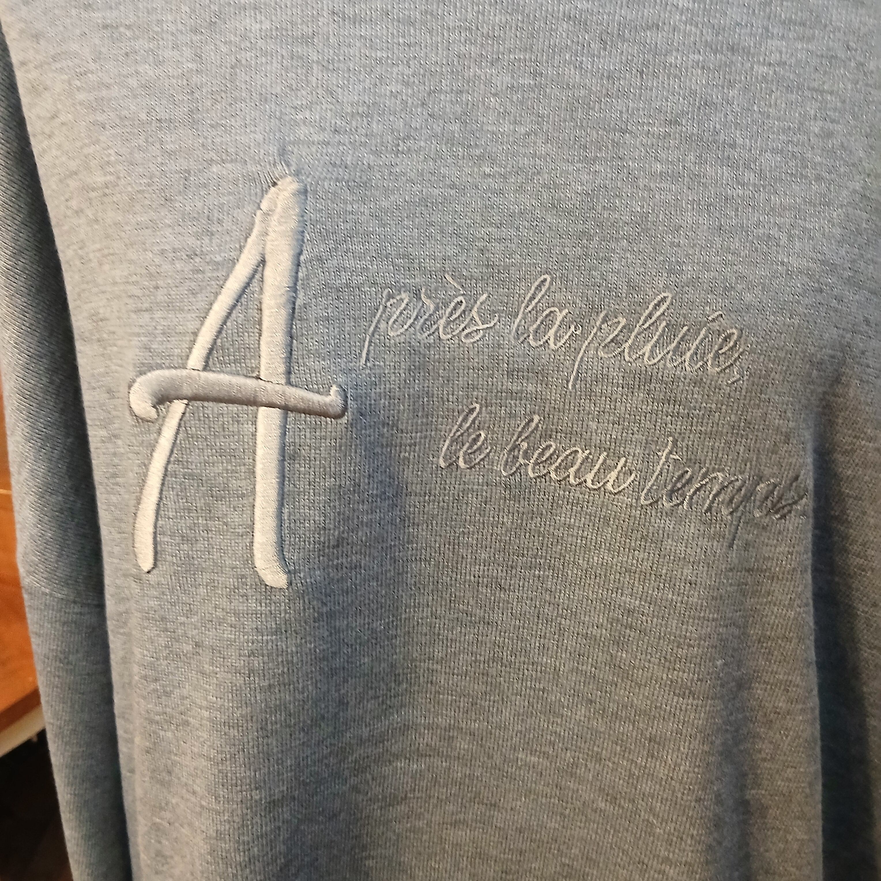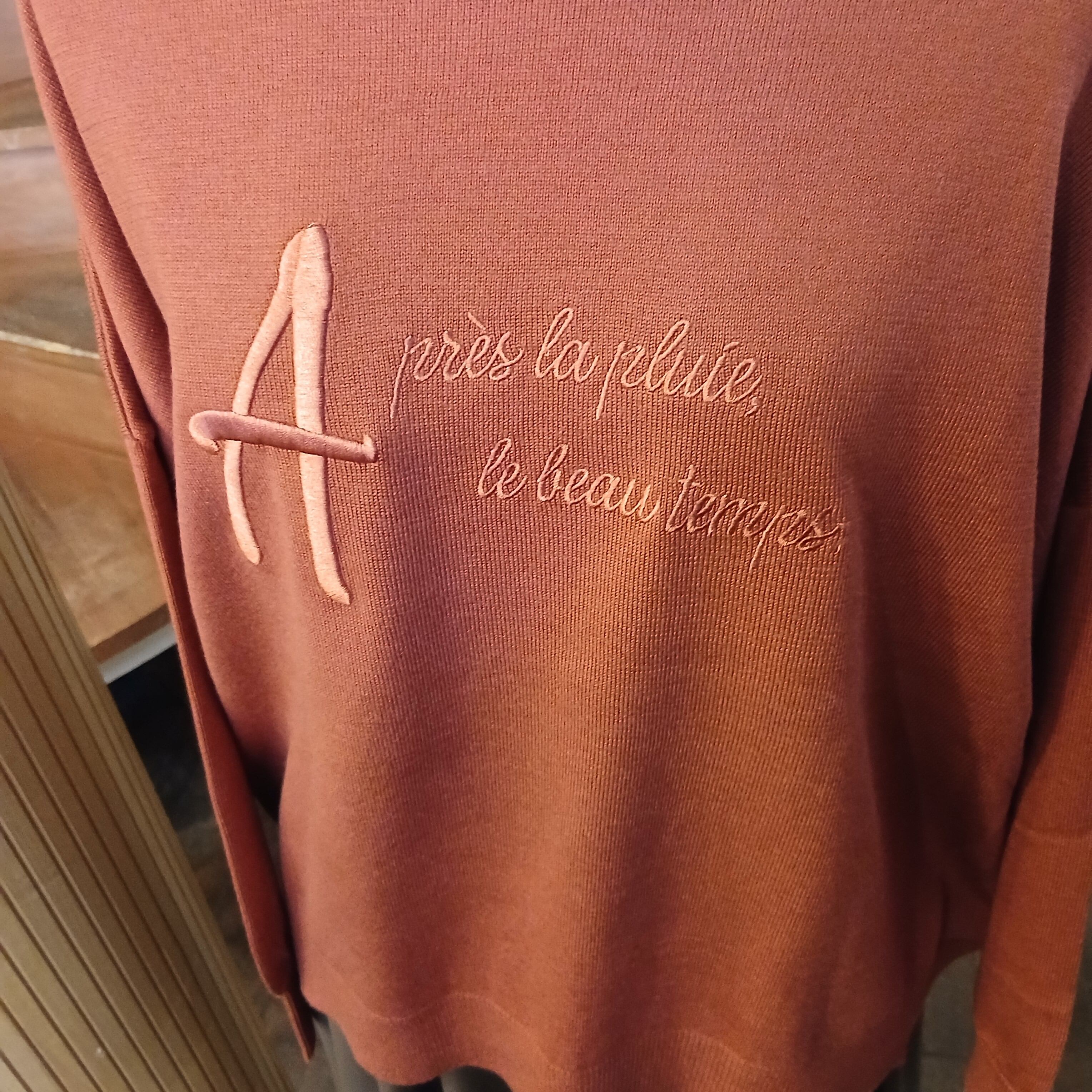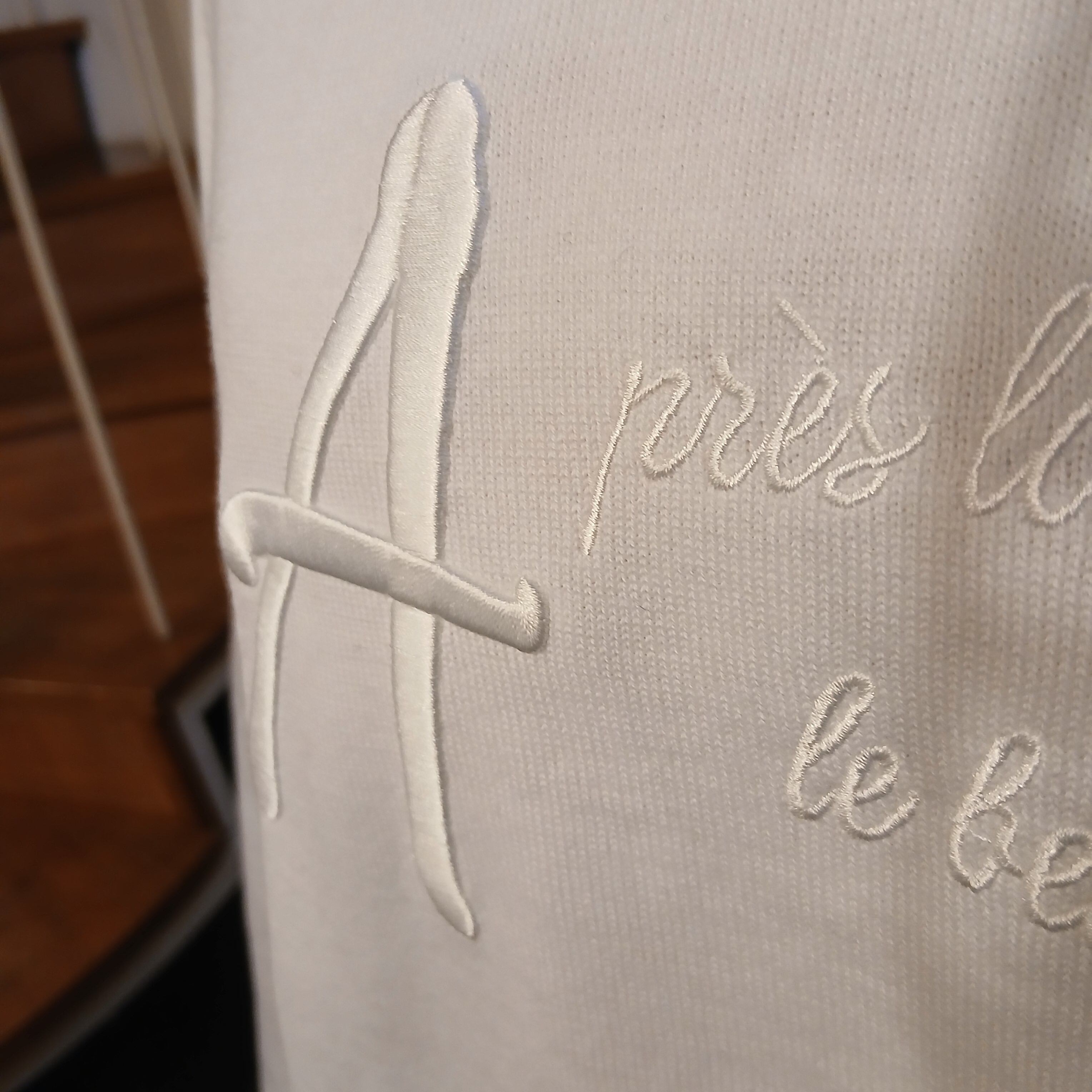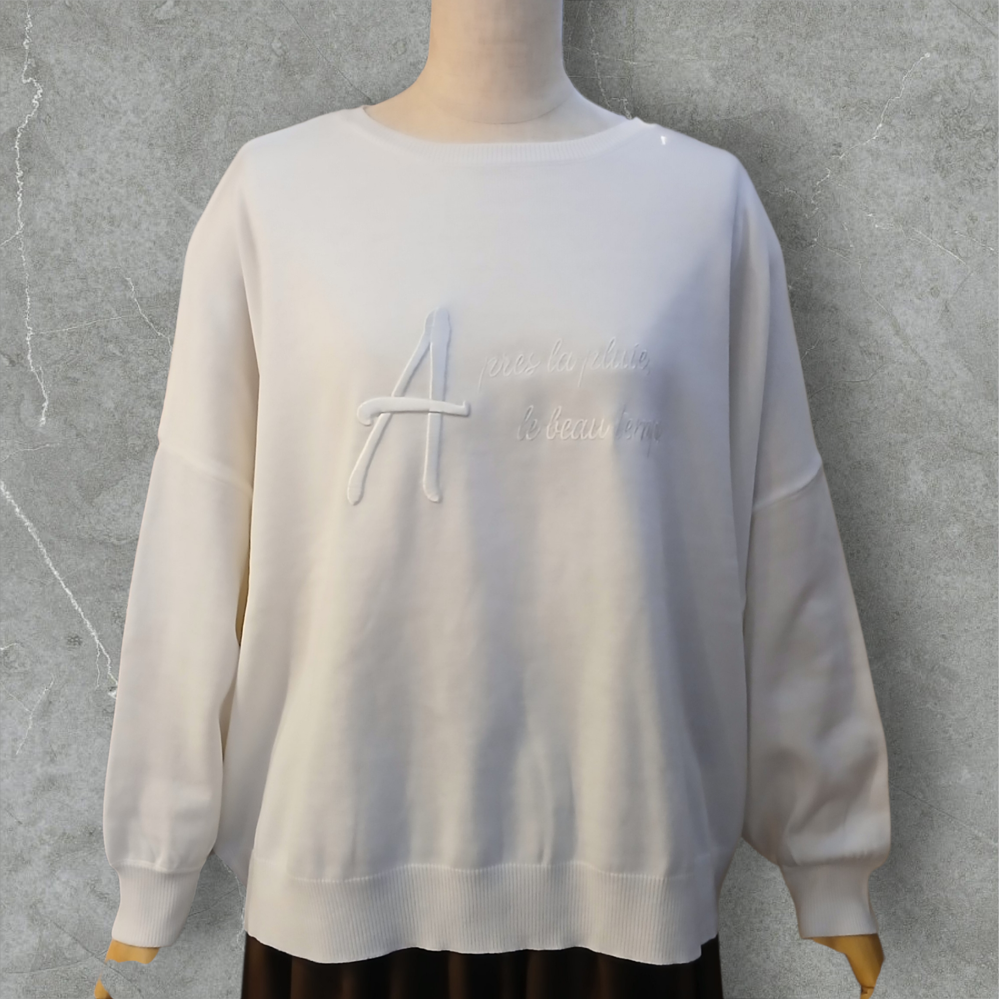 身頃と同色の立体刺繍がさりげない存在感の大人な雰囲気のロゴニットです。