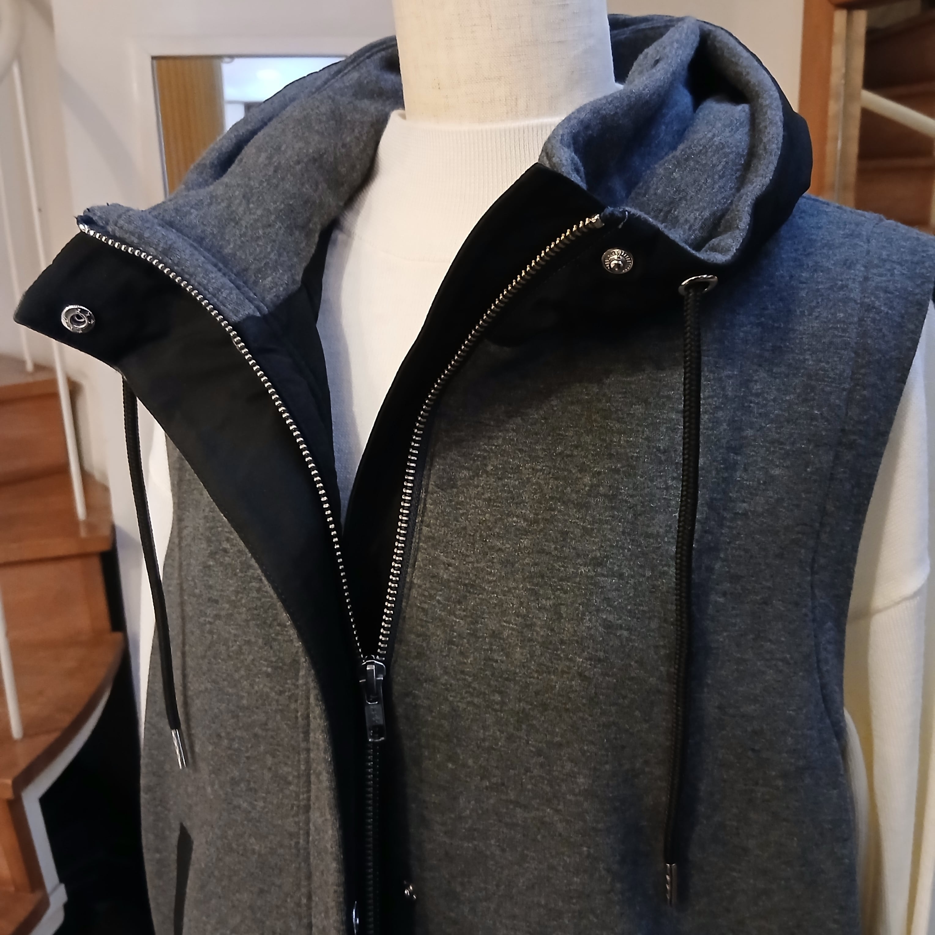2枚襟でフード風のボリュームネックで着るだけで首もとがキマるスタンドカラーベストです。