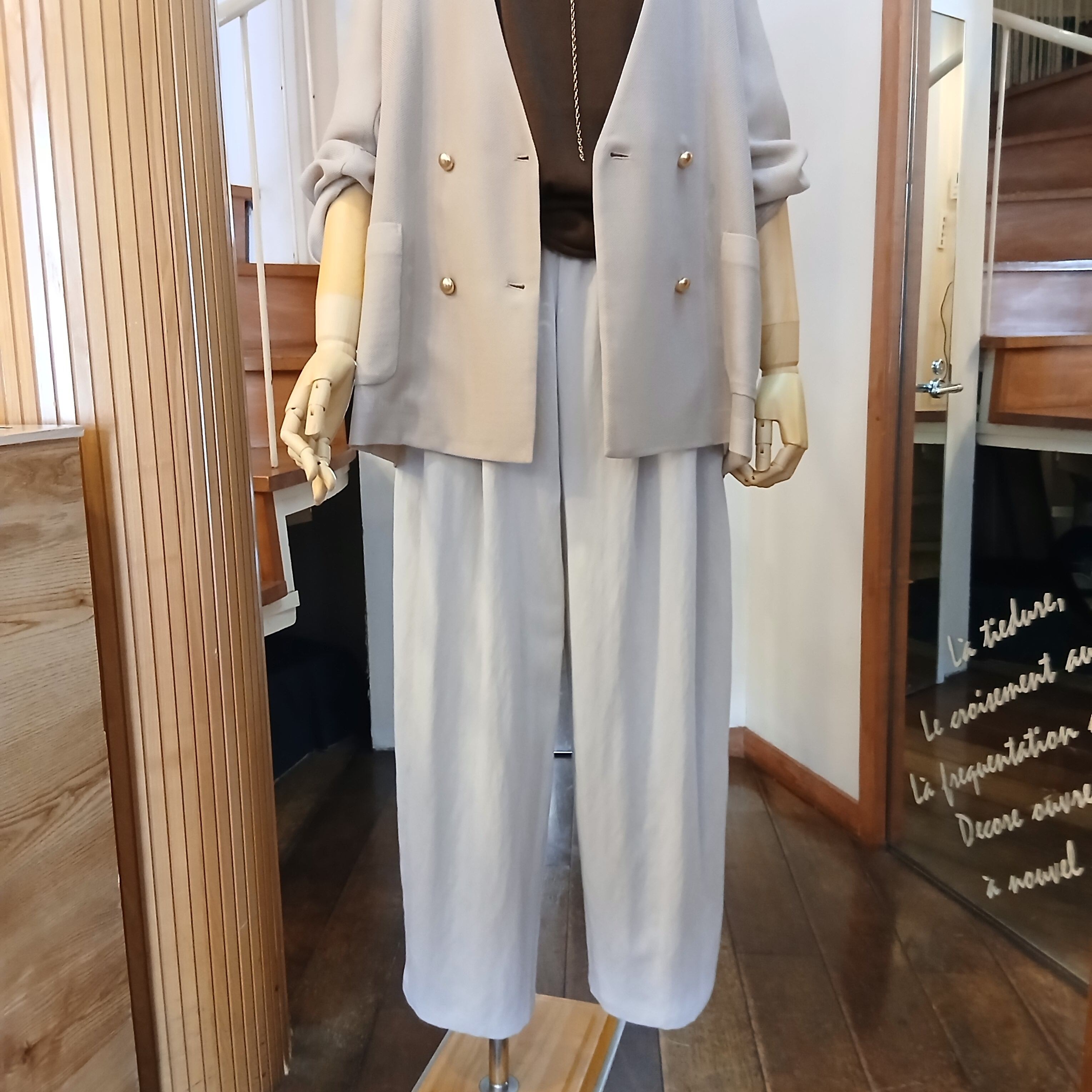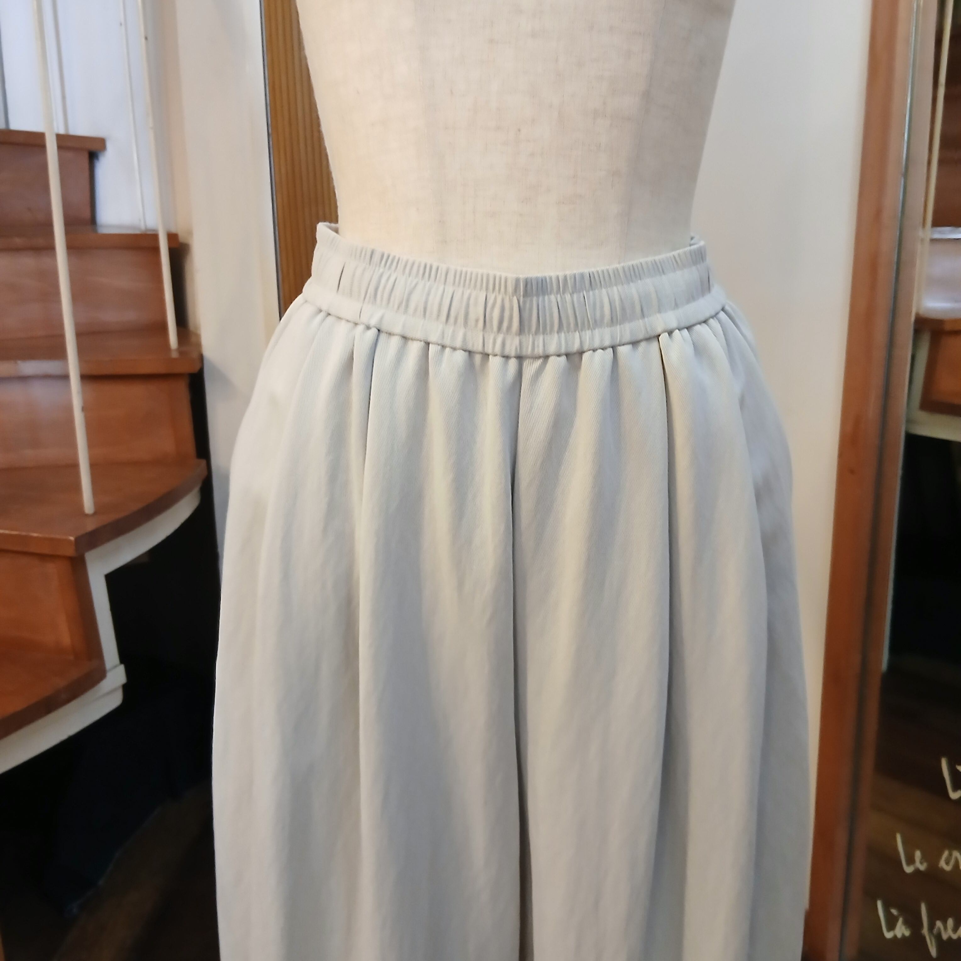 ヒップから太もも膝にゆったり丸みを帯び、裾に向けて緩やかに細くなるシルエットです。