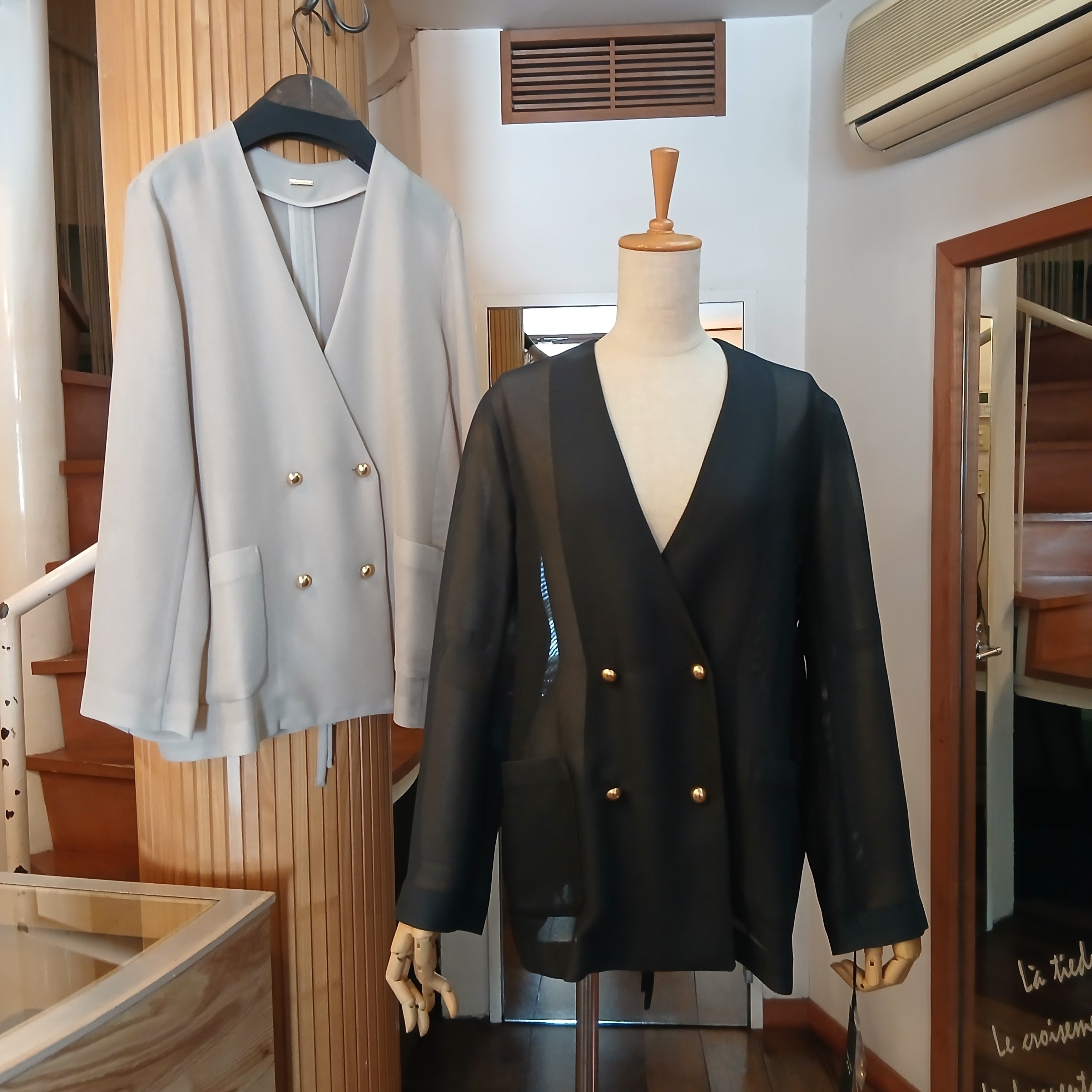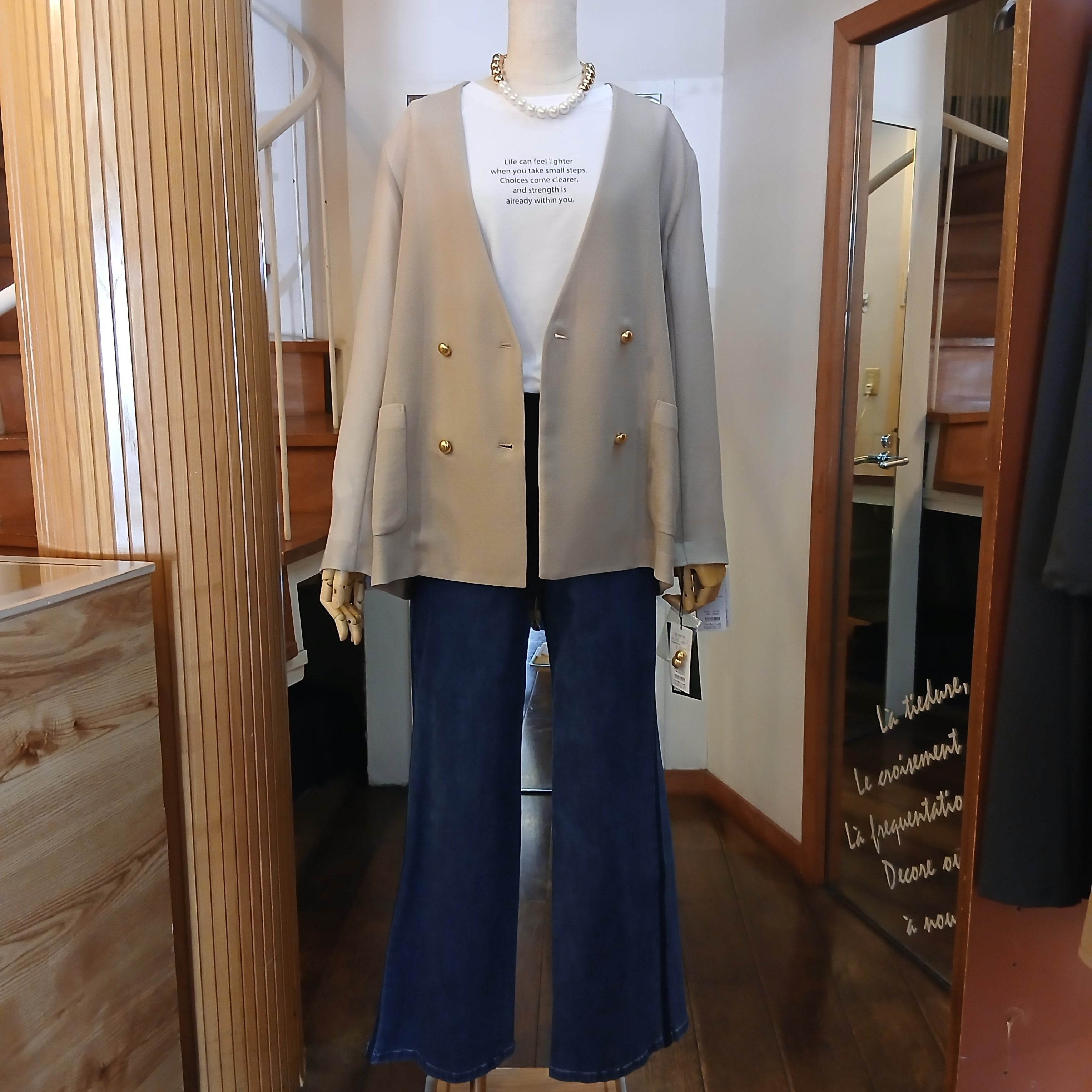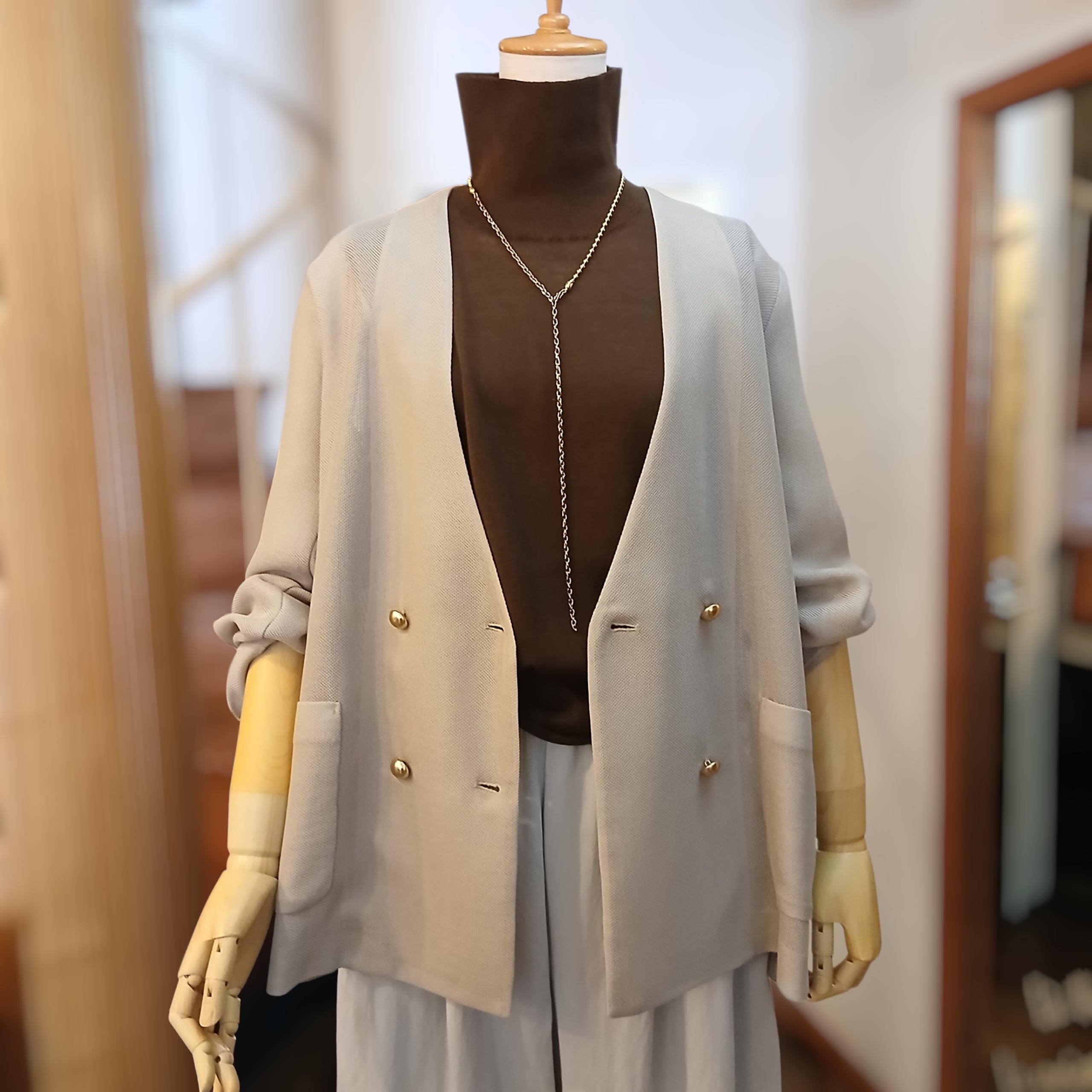 マットなゴールドボタンが大人っぽく、背中部分の深めのスリット仕様のバックスタイルが