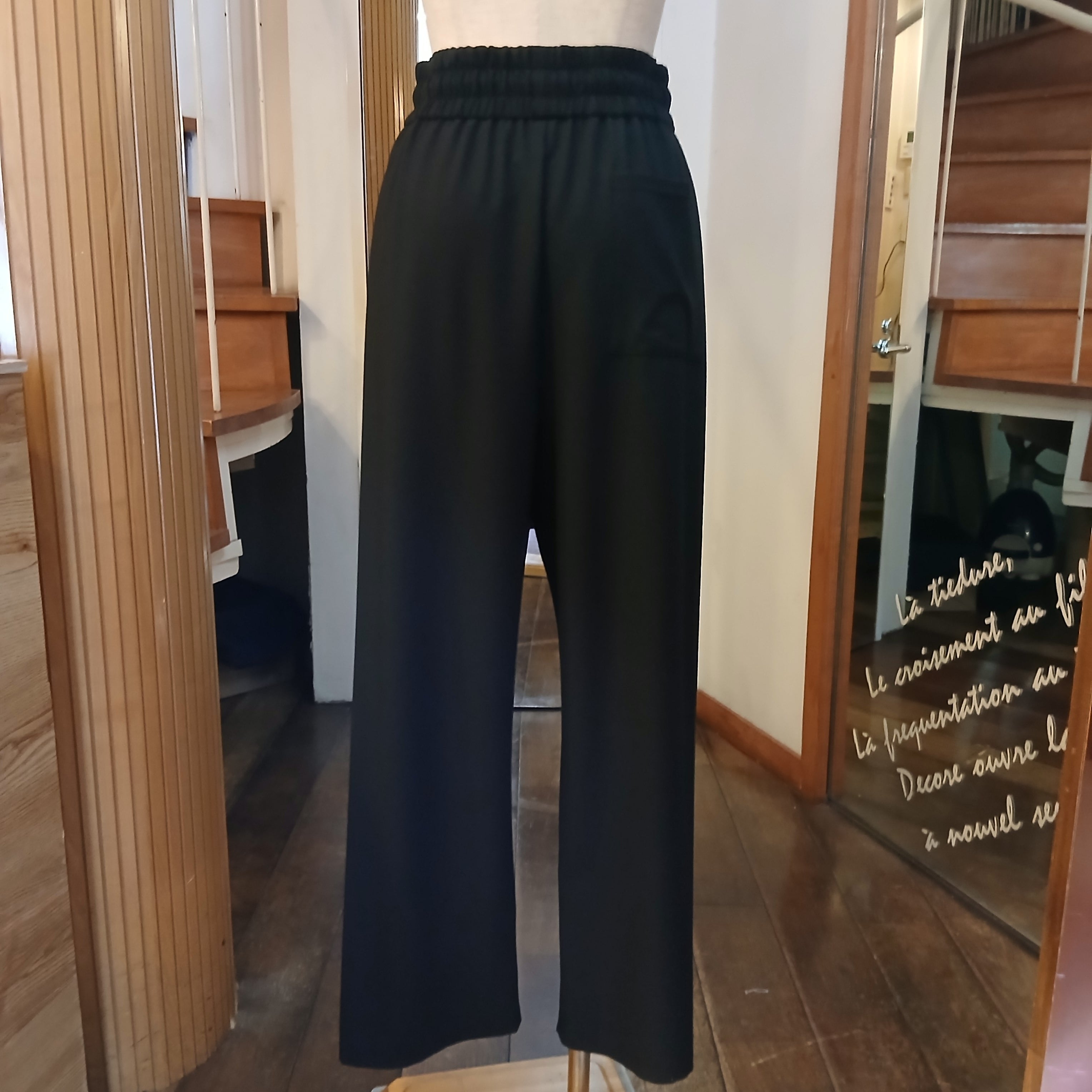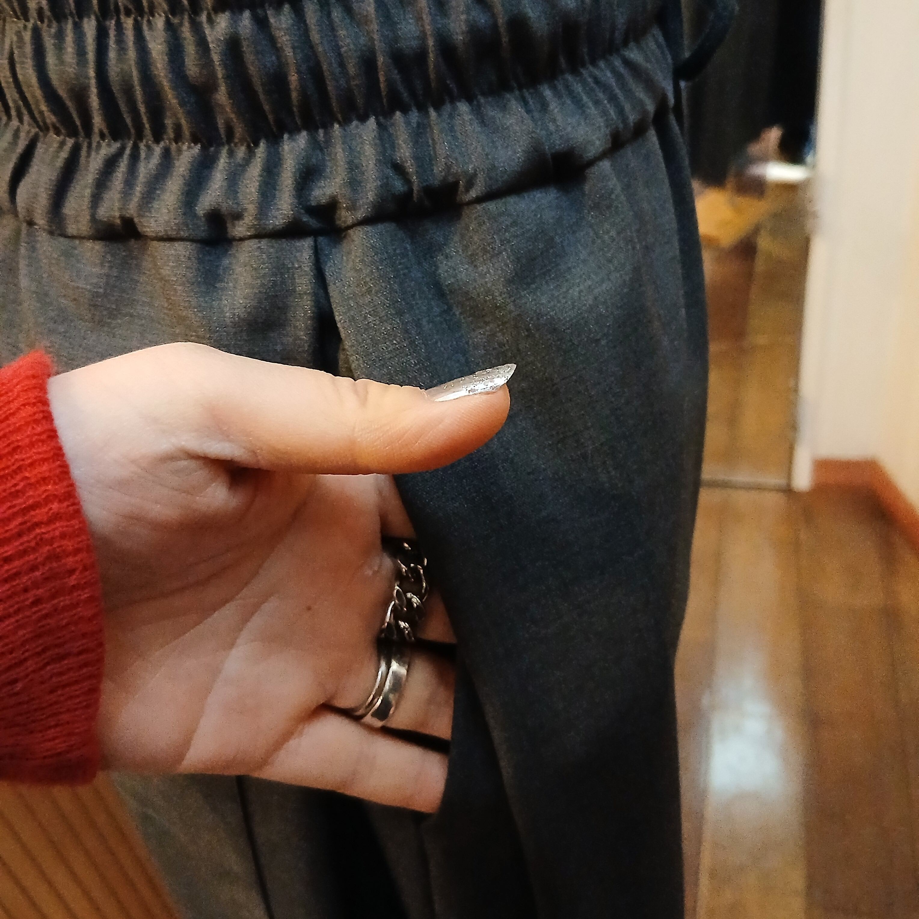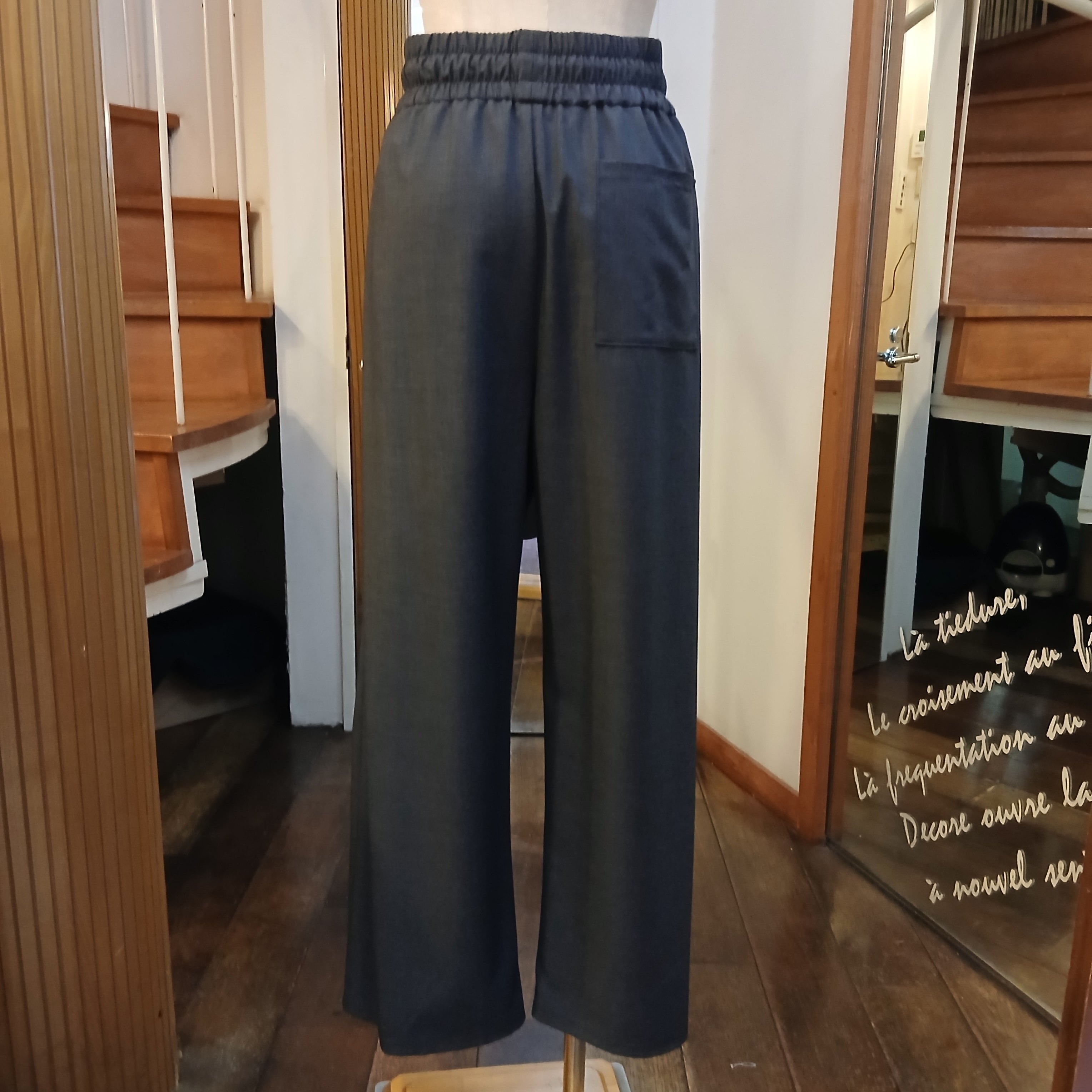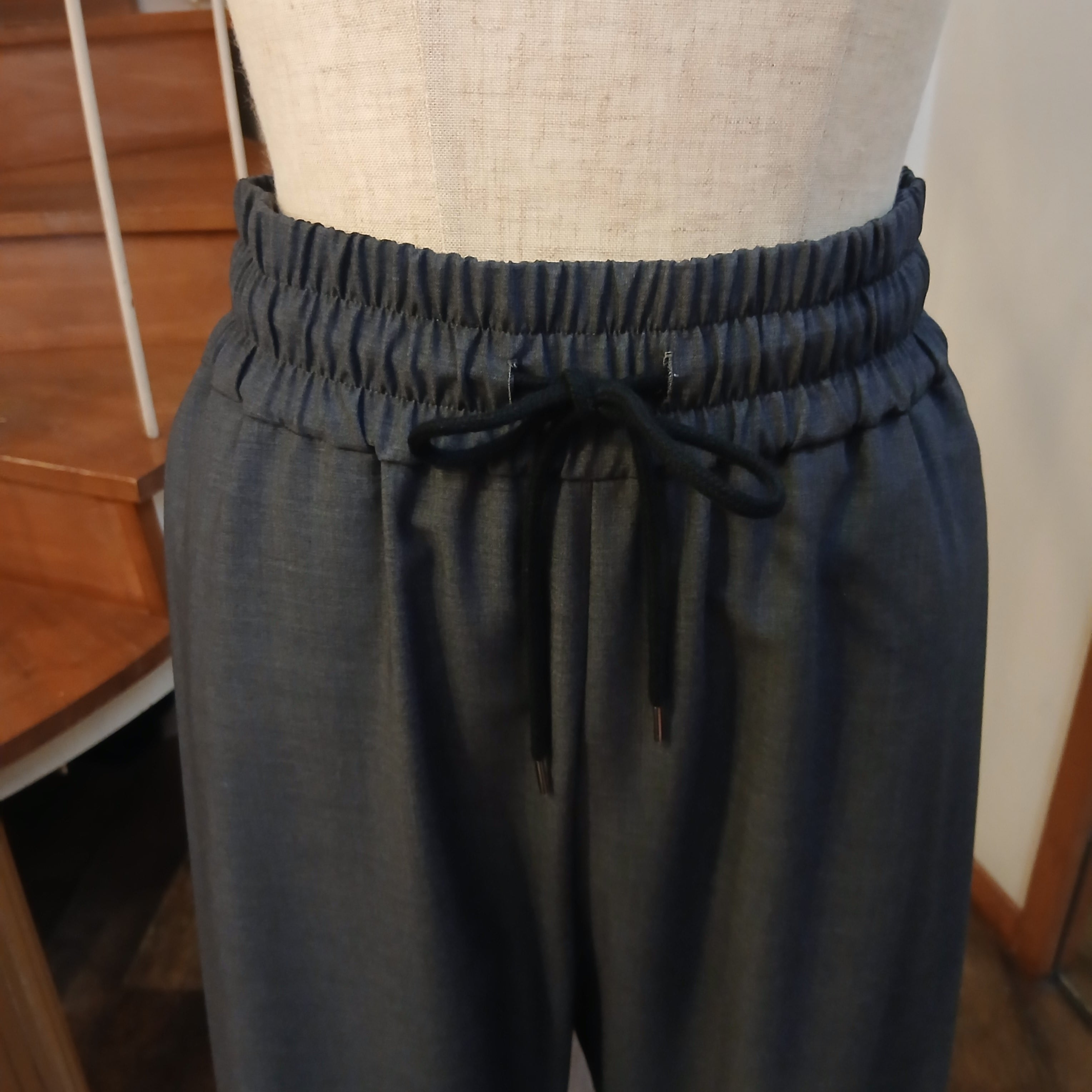 ウエスト下から両サイドにBOXタックが入りふくらみを持たせ、裾に向けて緩やかに