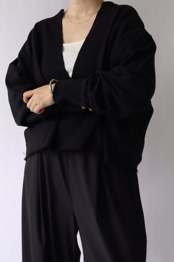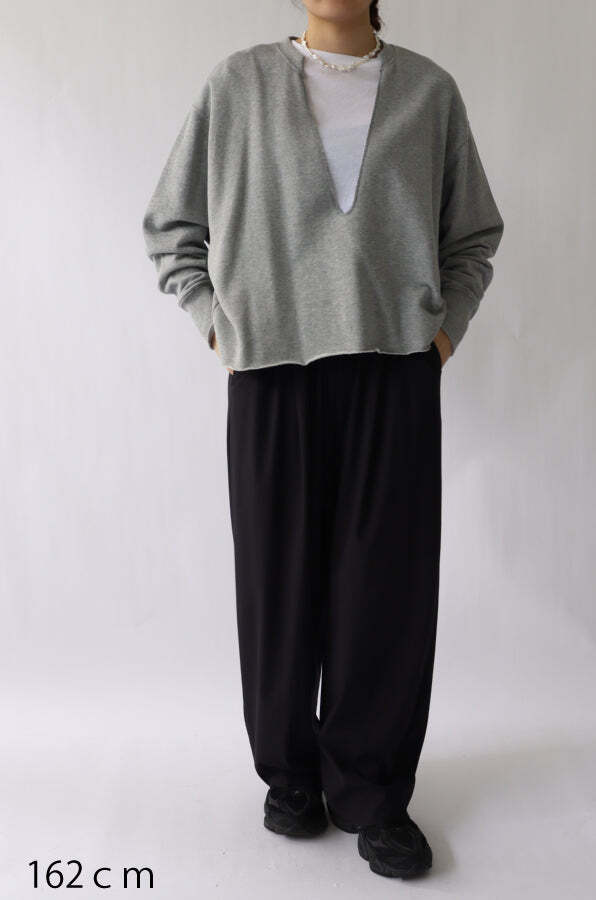 深Vネックのデザインと裾のカットオフ仕様が特徴。