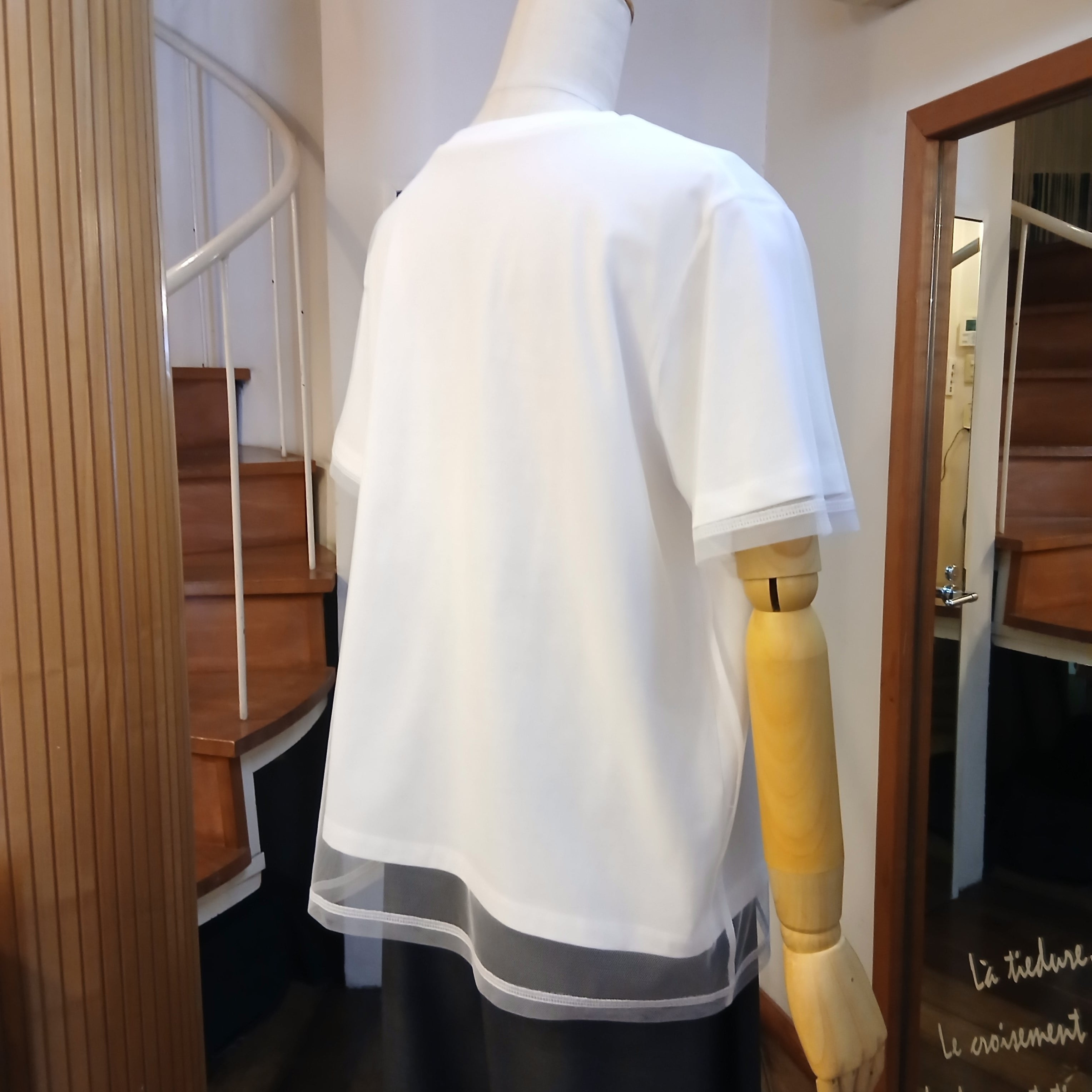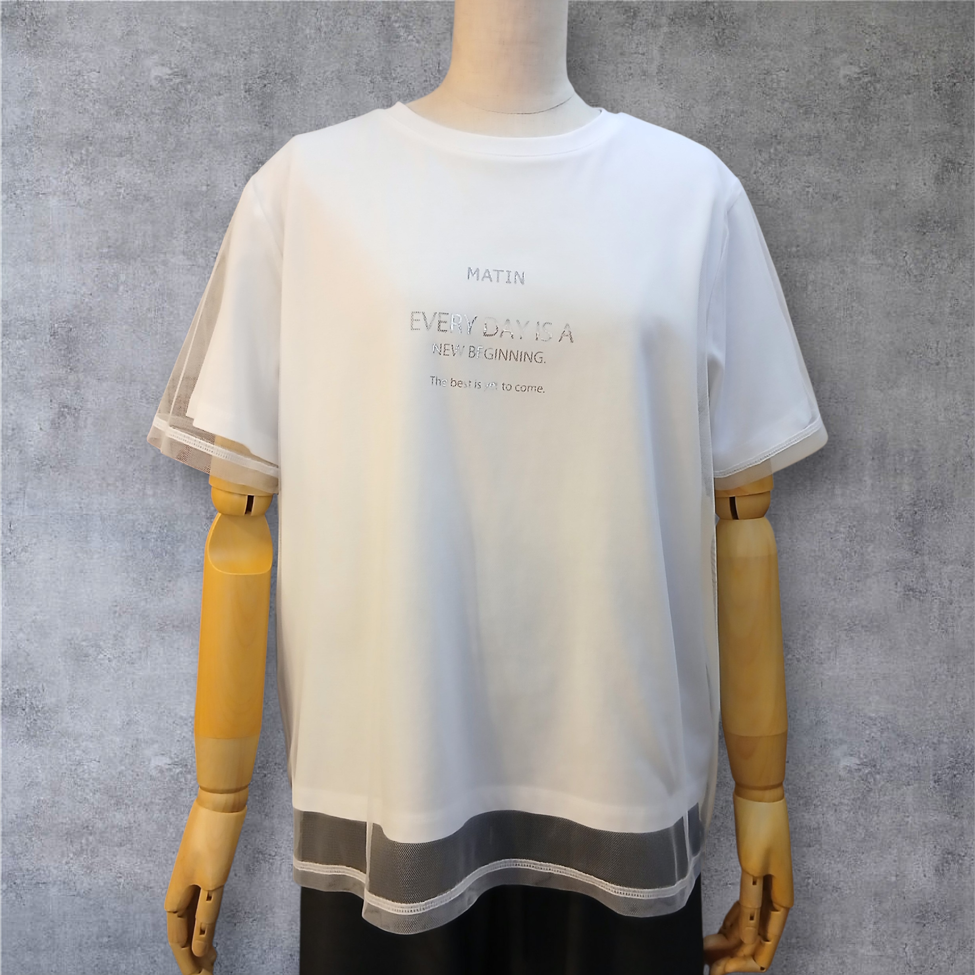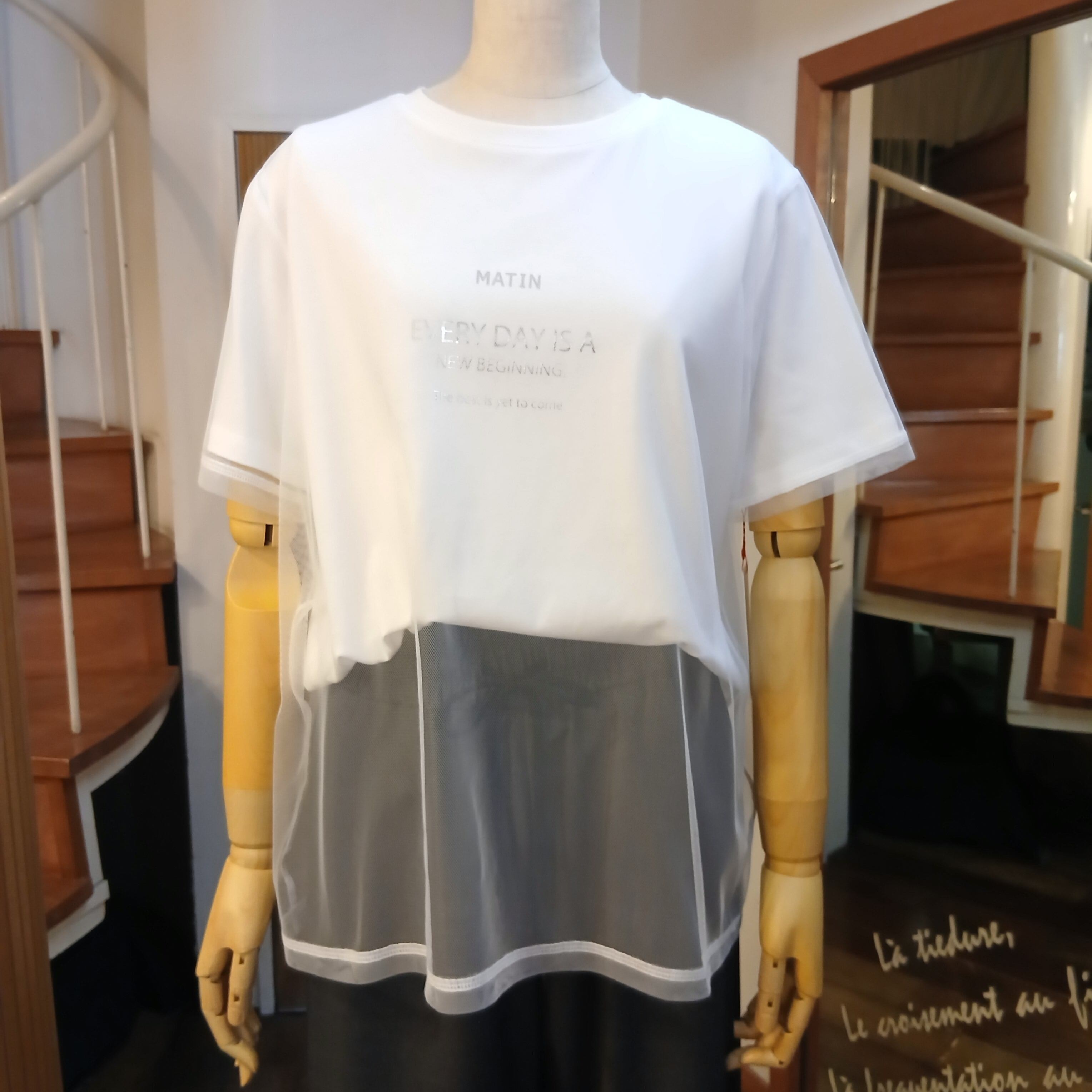 カジュアルになりがちなロゴteeにチュールを重ねることで上品さをプラス。
