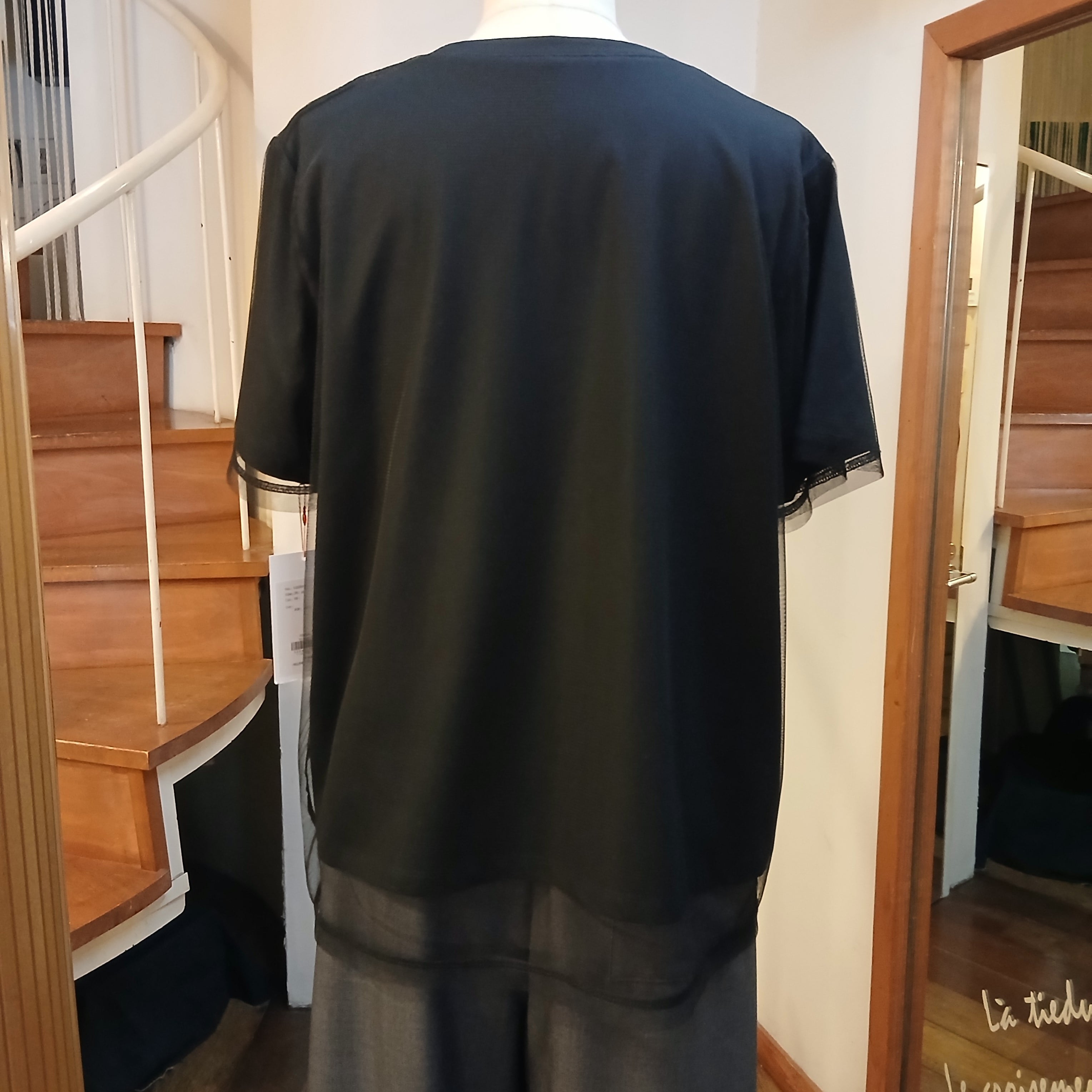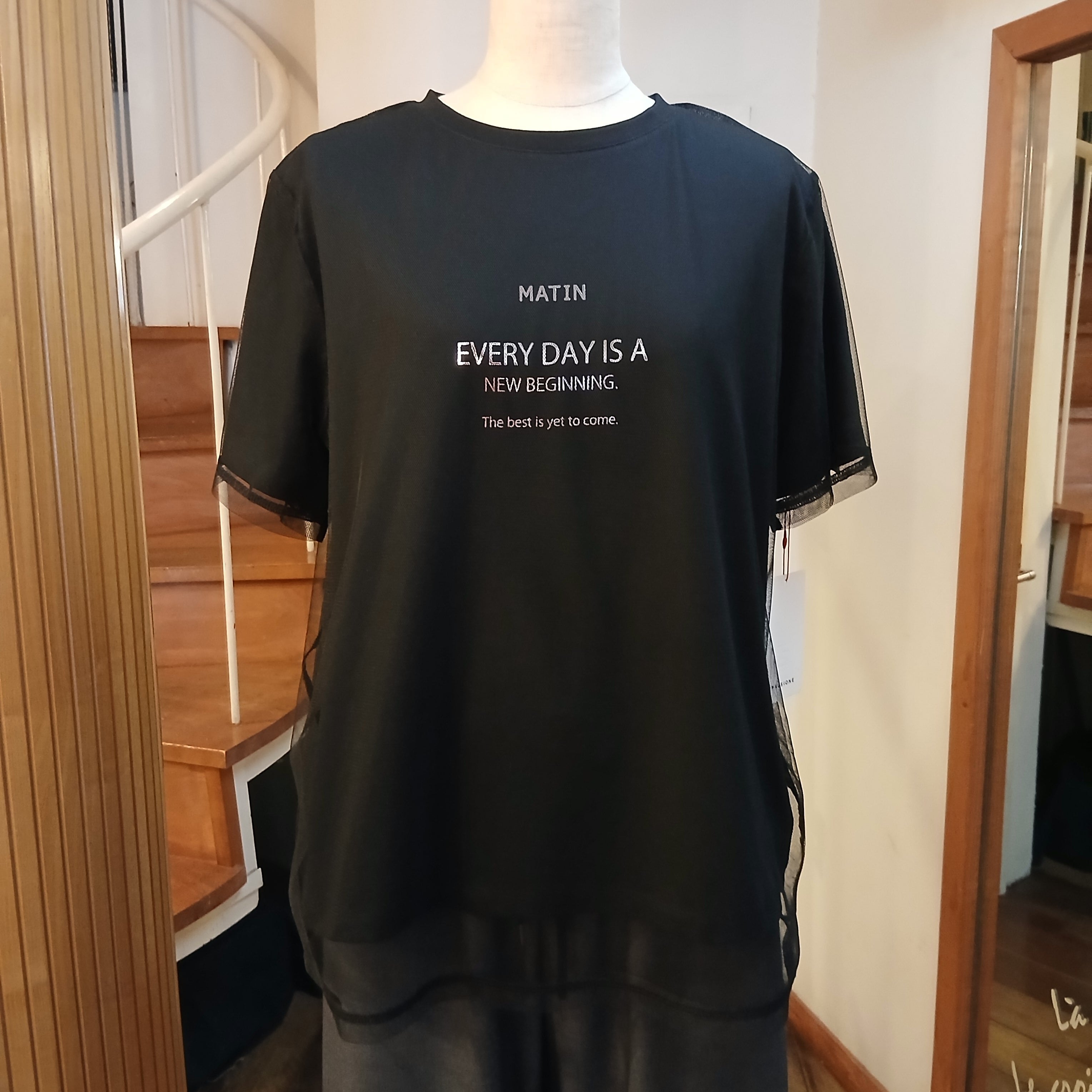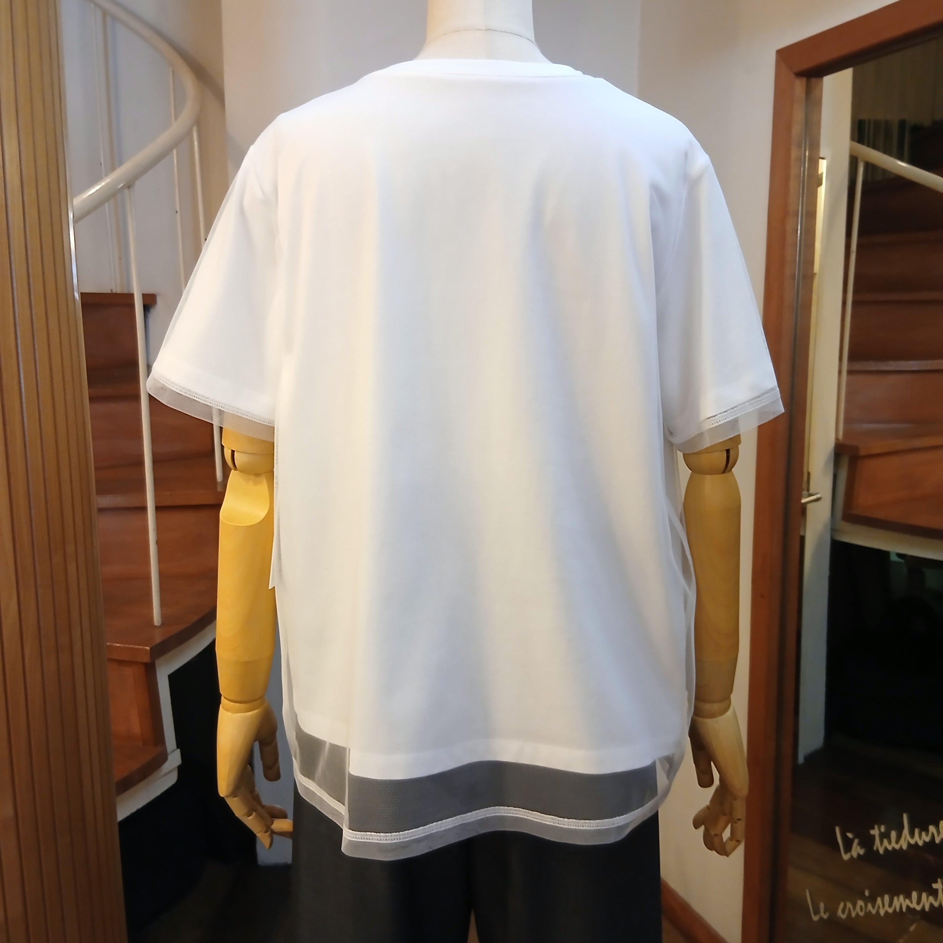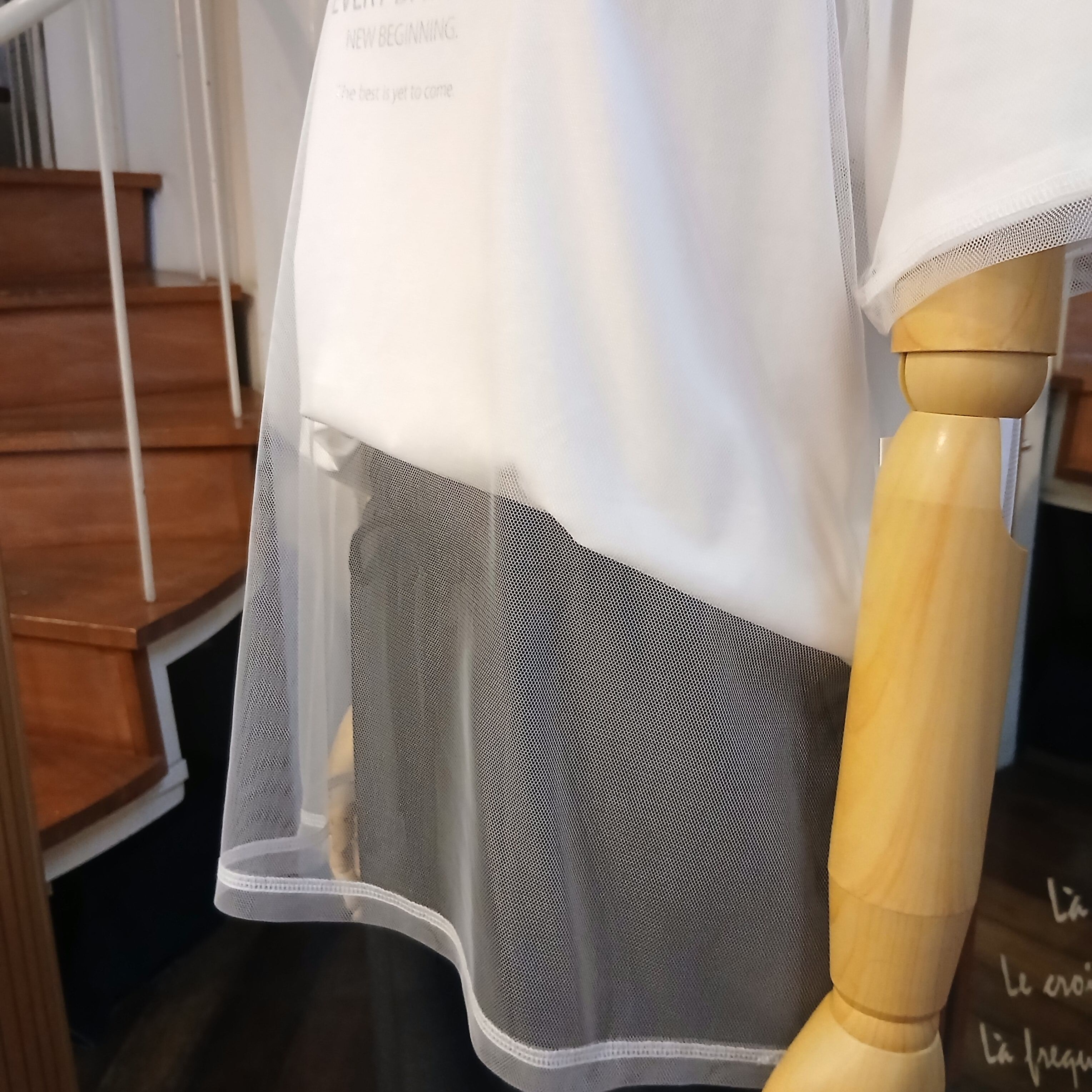 カジュアルになりがちなロゴteeにチュールを重ねることで上品さをプラス。