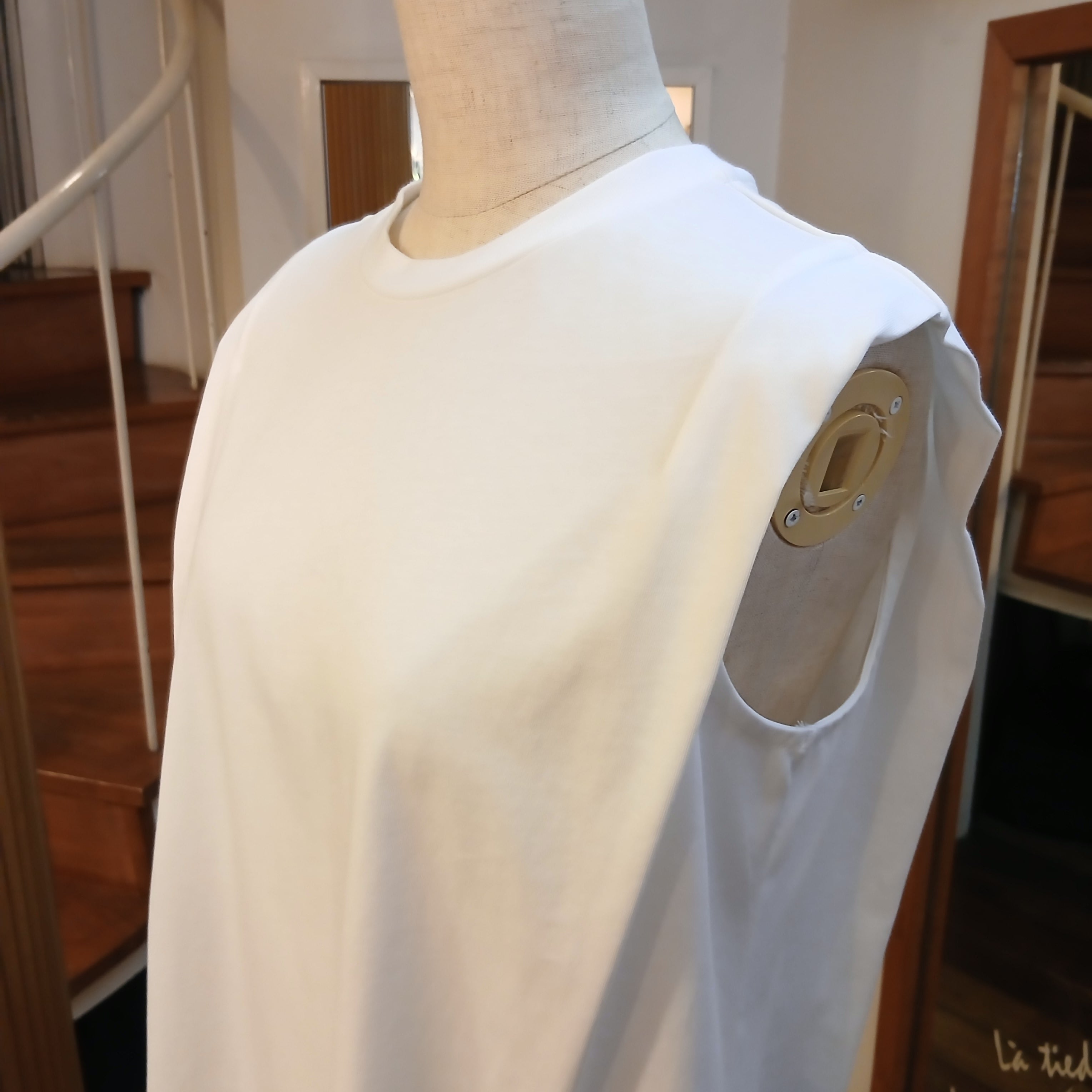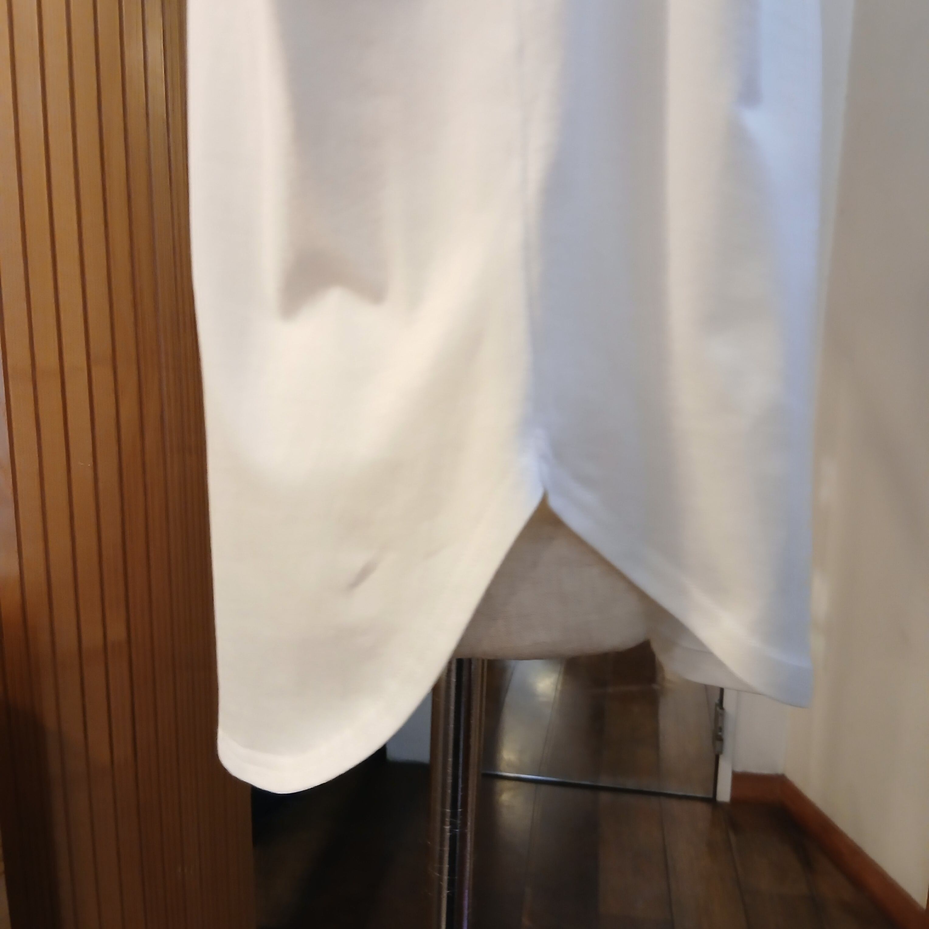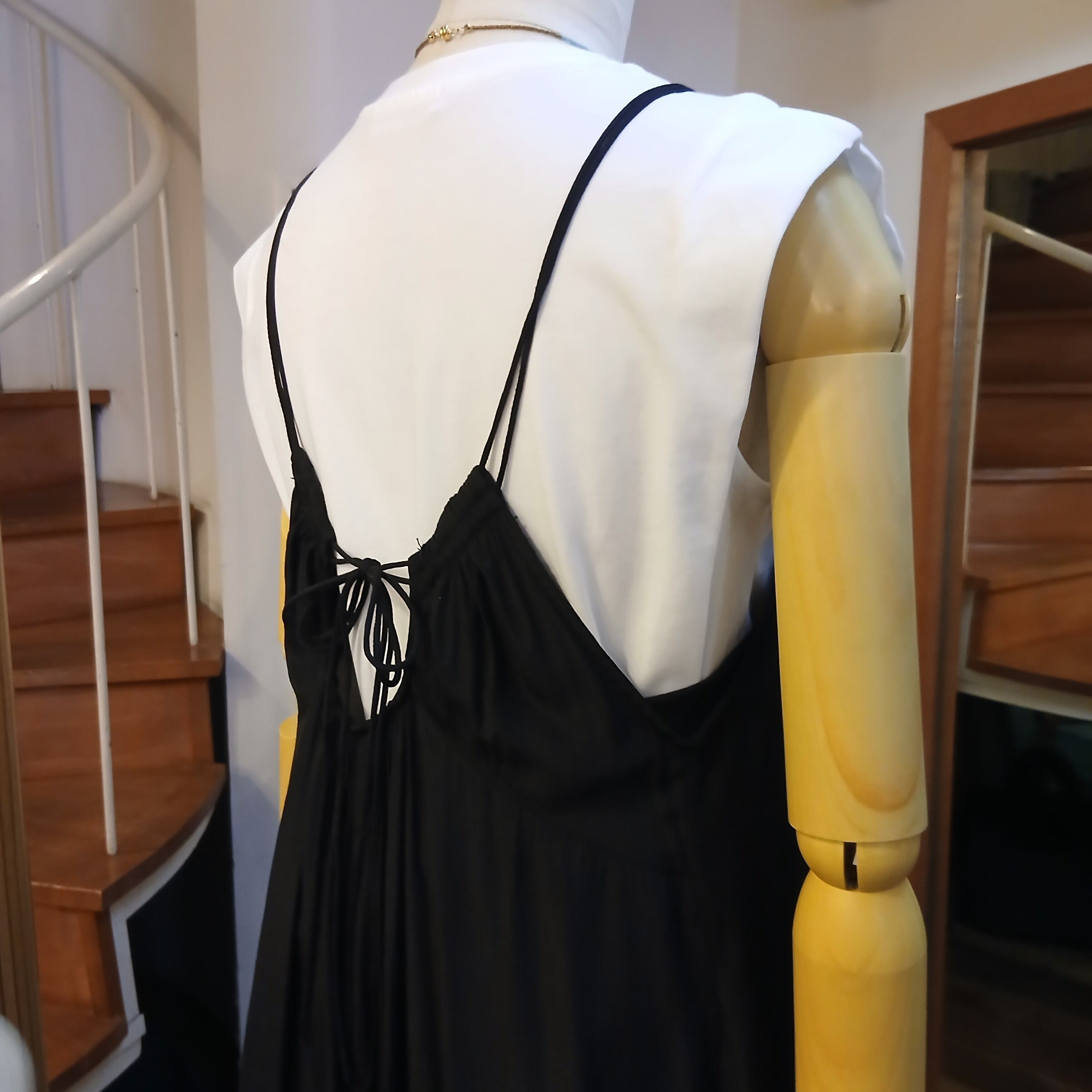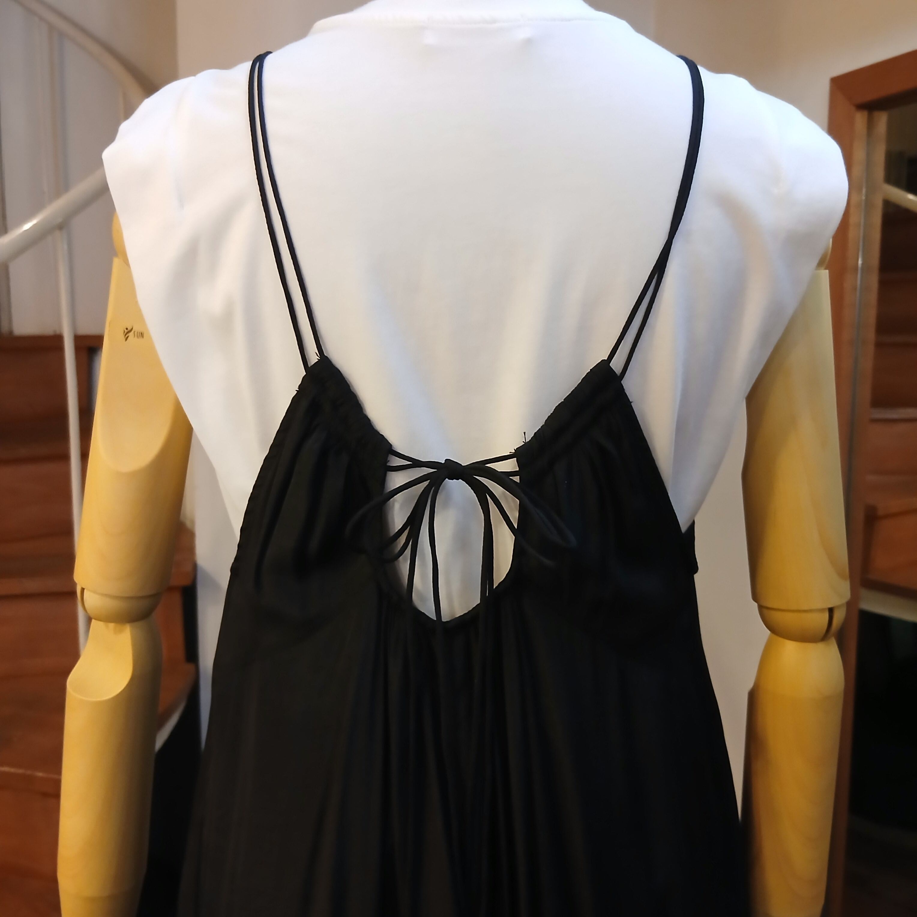 胸元、背中のたっぷりギャザーを通した2本どりの紐で絞りや長さを調節することができます。