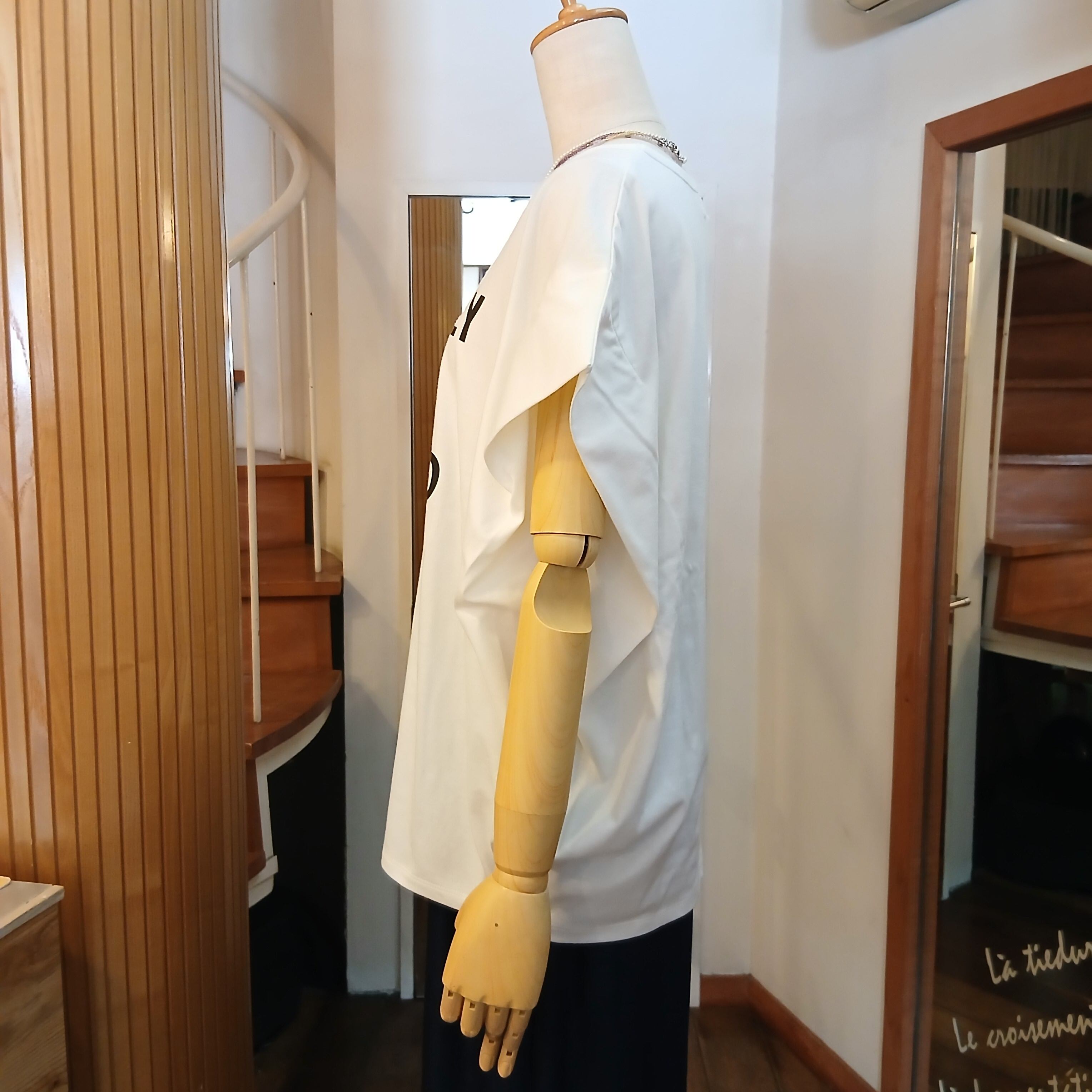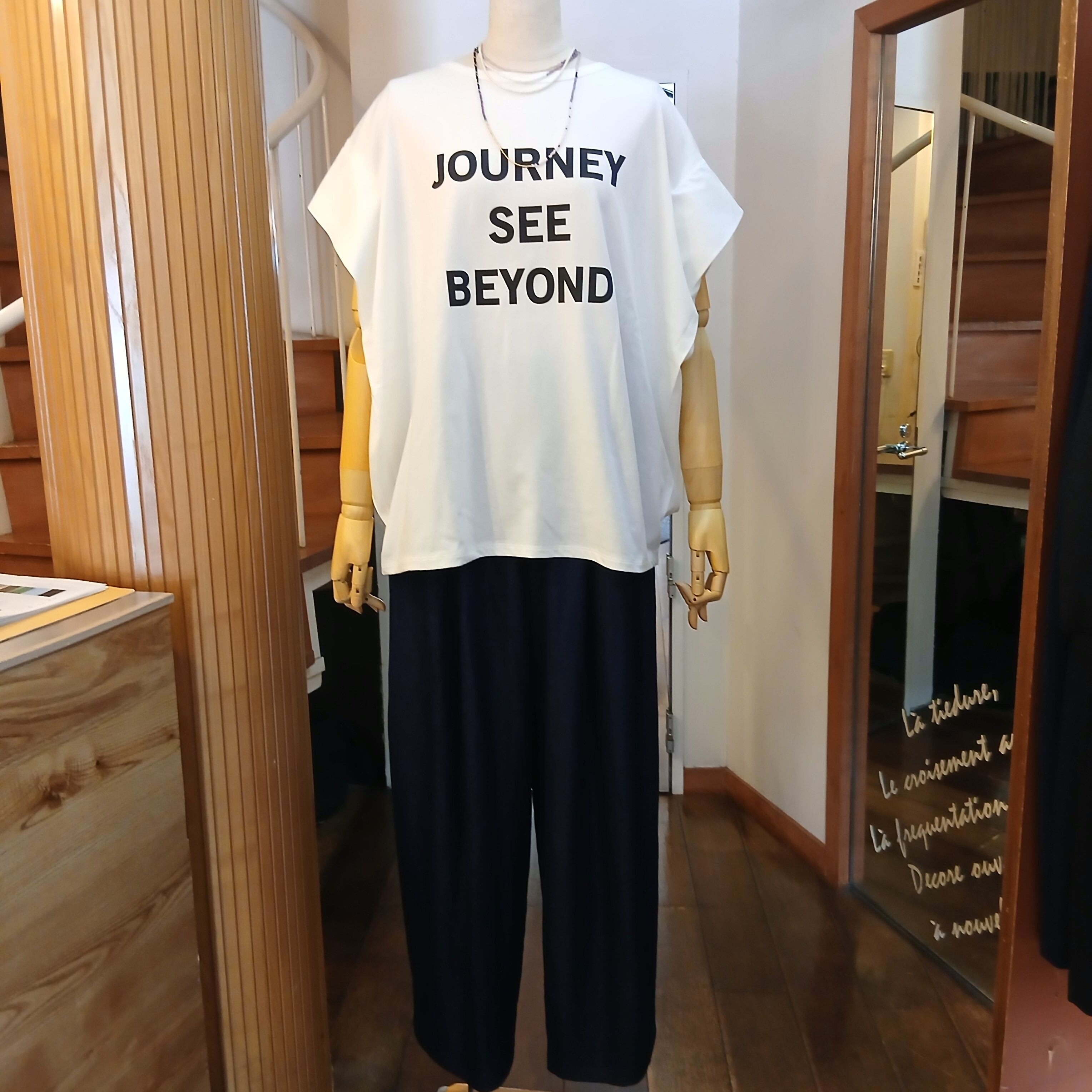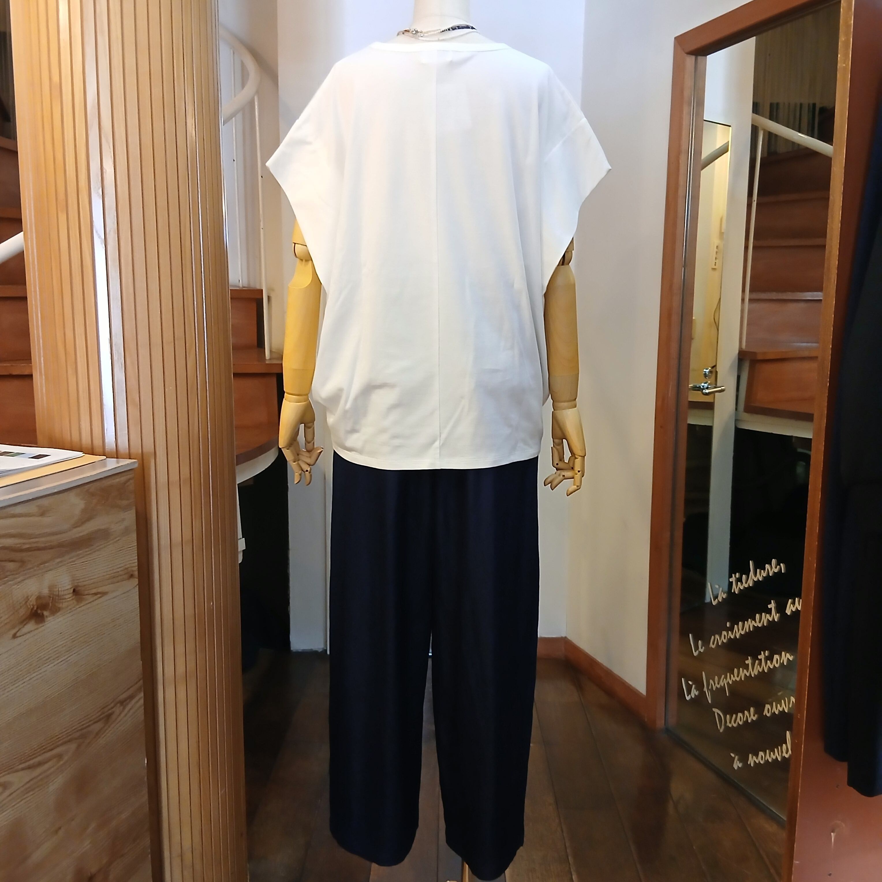 袖のタックが二の腕をカバーし、裾に向けて緩やかにコクーンシルエットです。
