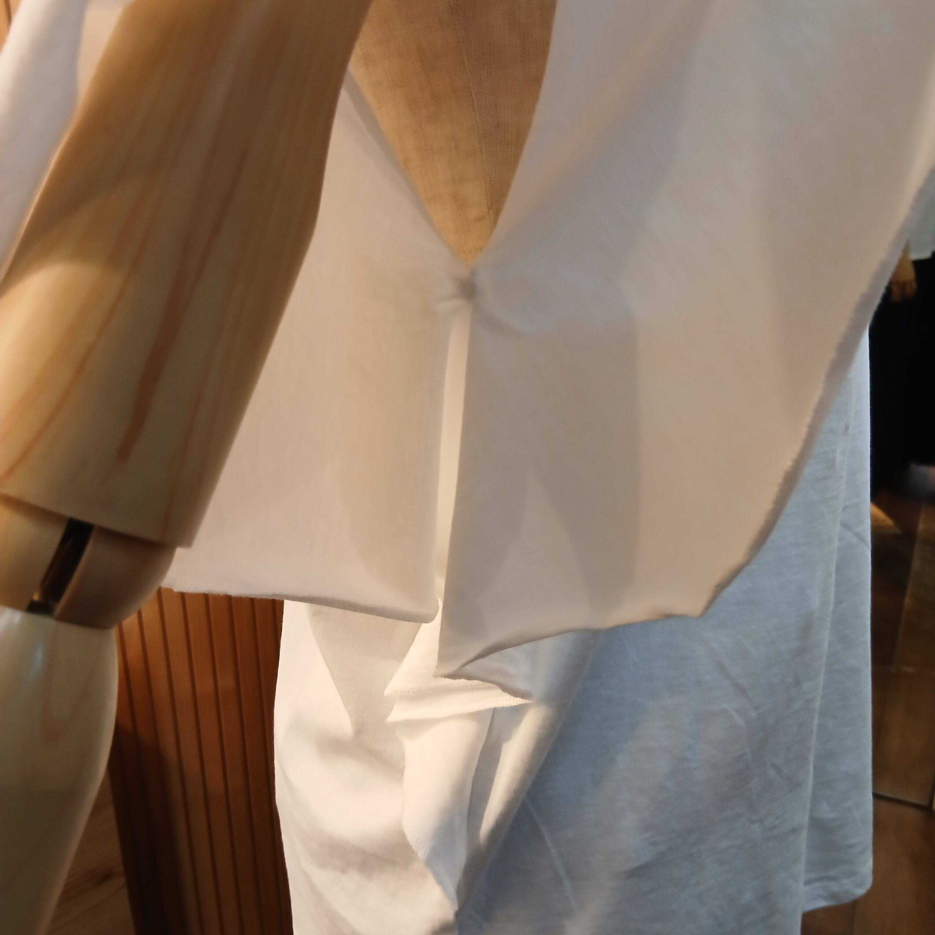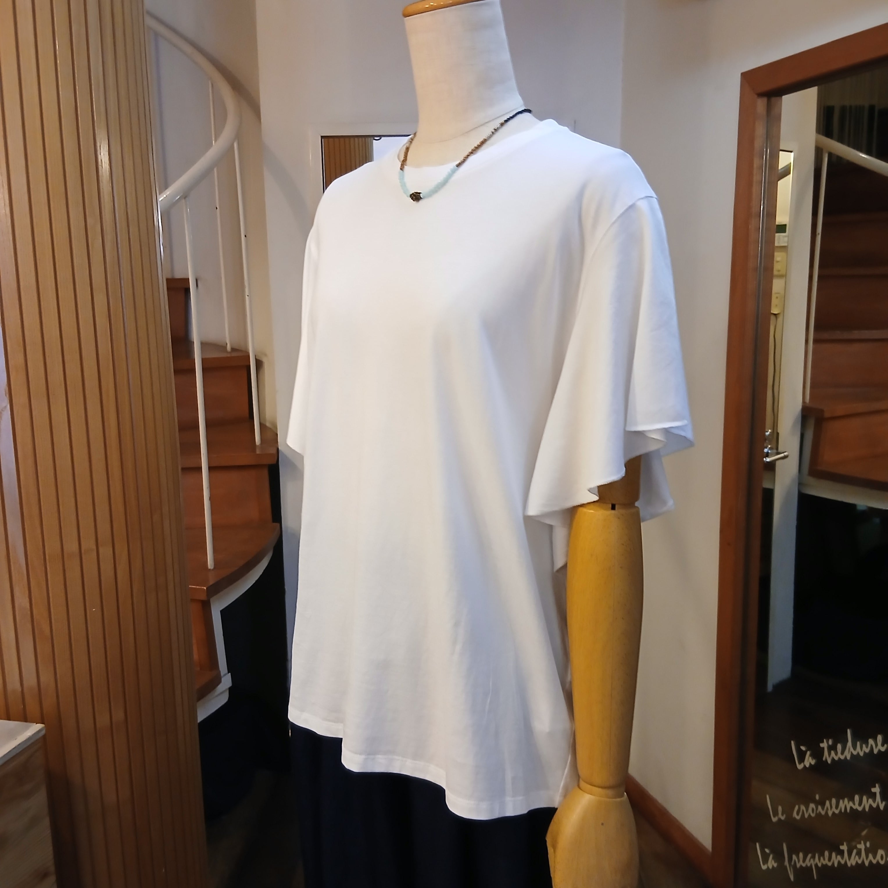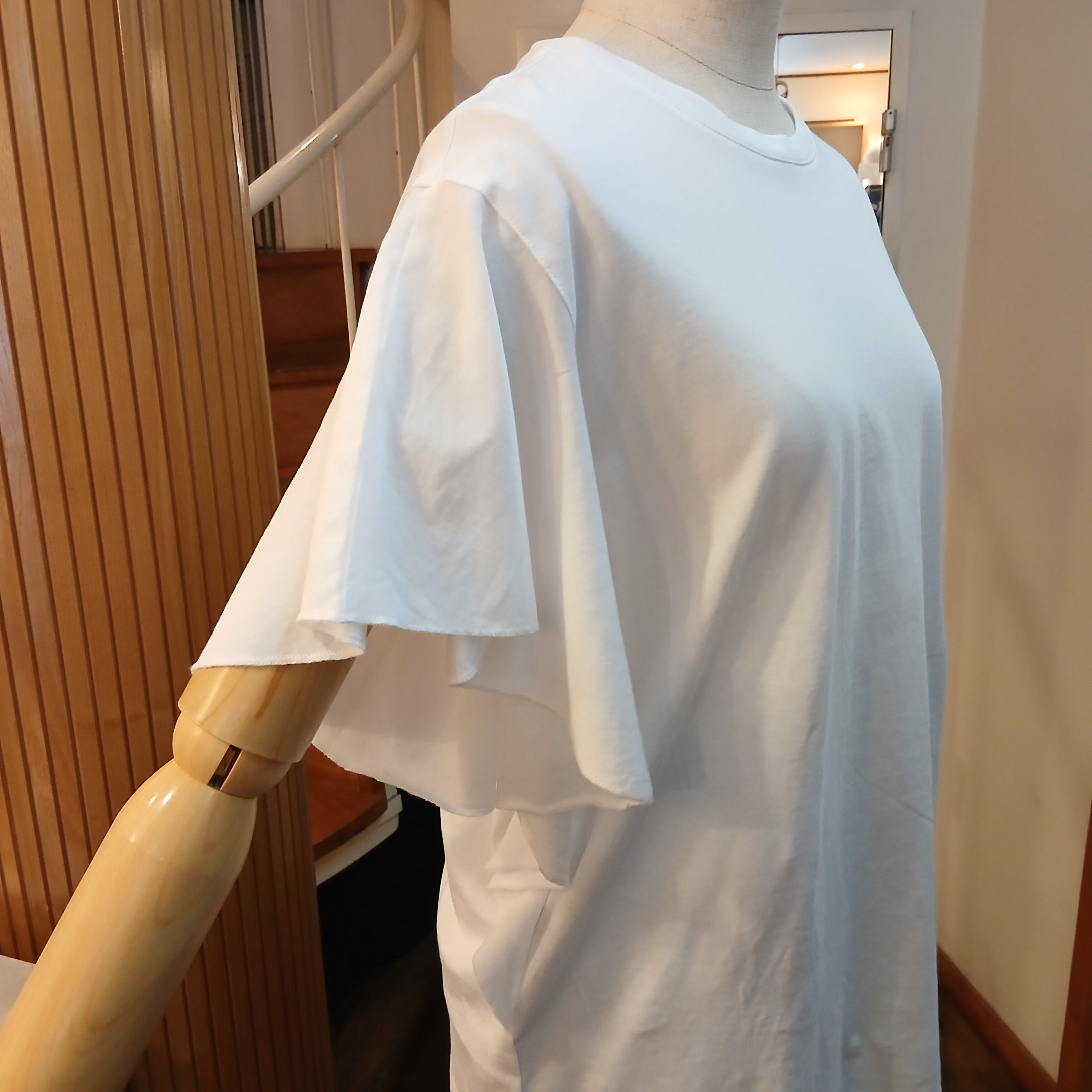 フリルスリーブが女性らしくブラウス感覚なので、デイリーユースからオフイスコーデ迄